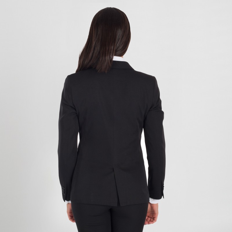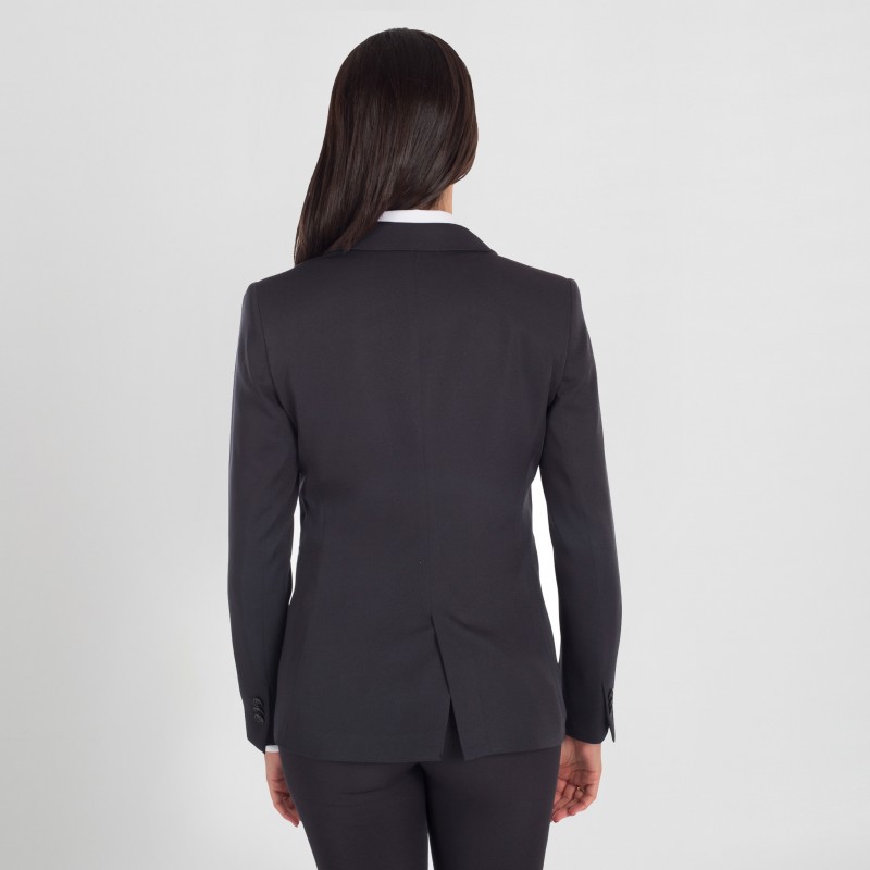 Americana de mujer ajustada, con un botón, pinzas en delantero y abertura trasera central.