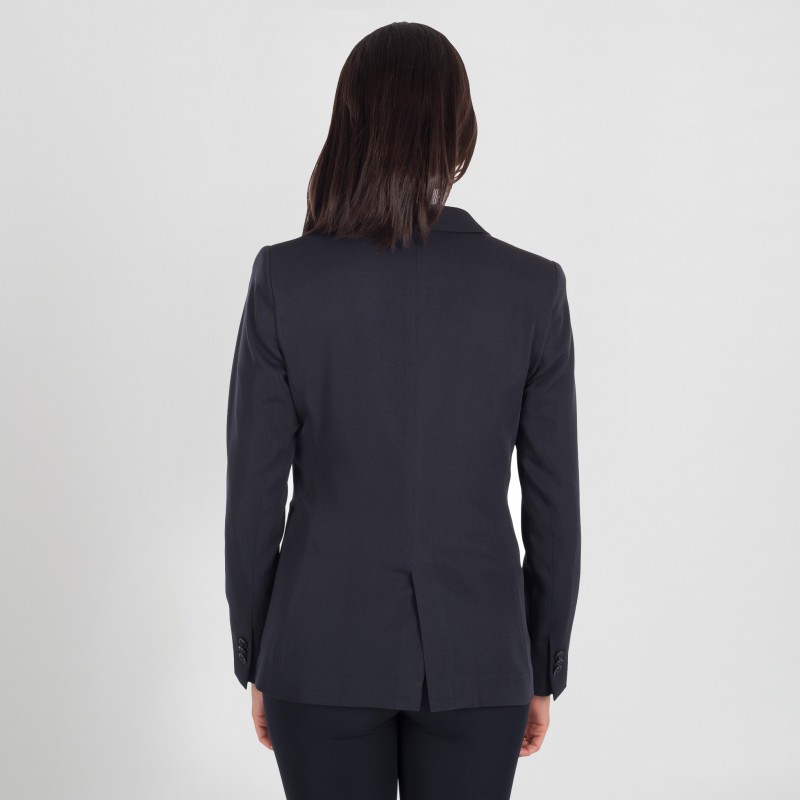 Americana de mujer ajustada, con un botón, pinzas en delantero y abertura trasera central, tres bolsillos delanteros de vivo, uno en pecho y dos laterales, confeccionado en tejido BIELÁSTICO, resistencia a las manchas y fácil planchado.