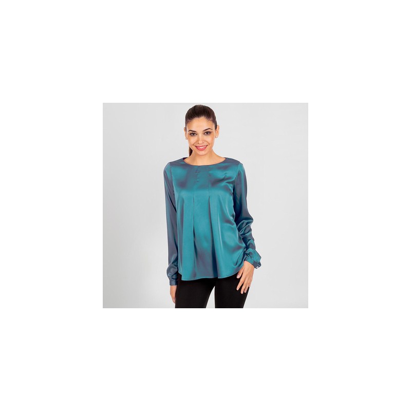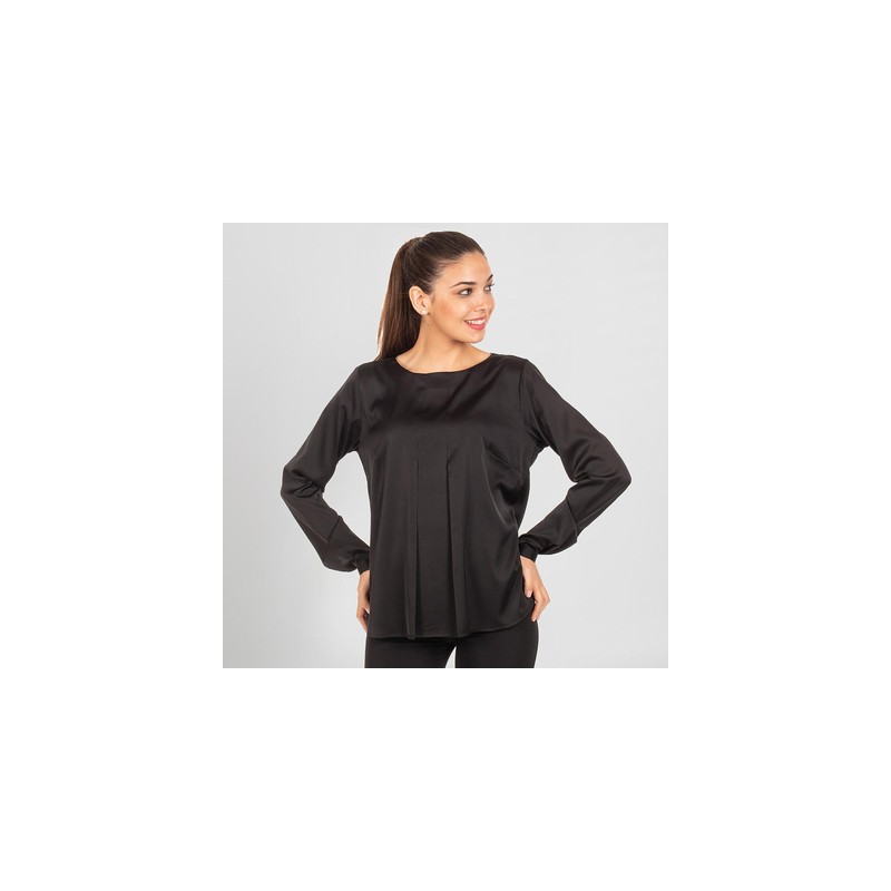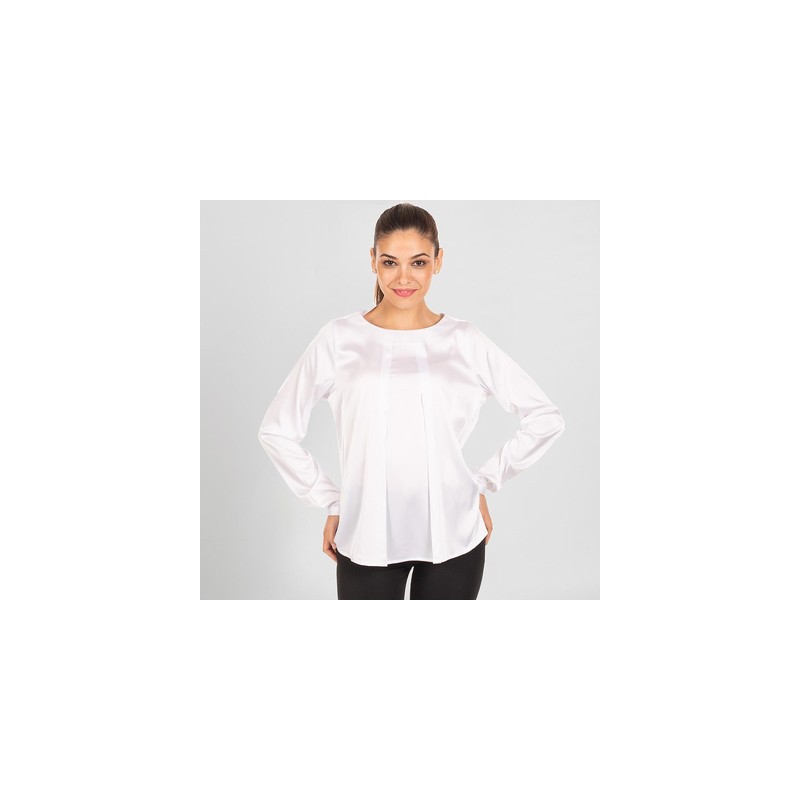 Blusa de mujer en manga larga, con cuello redondo y dos tablas en delantero a la altura del pecho, confeccionado en SATÉN, con puños abotonados y pinzas en costados y espalda.
