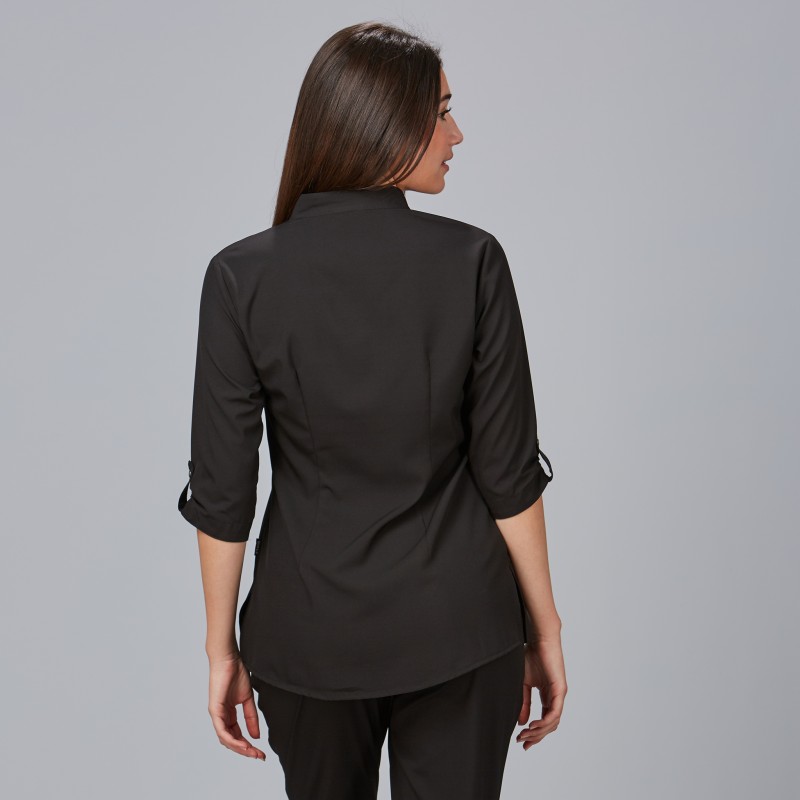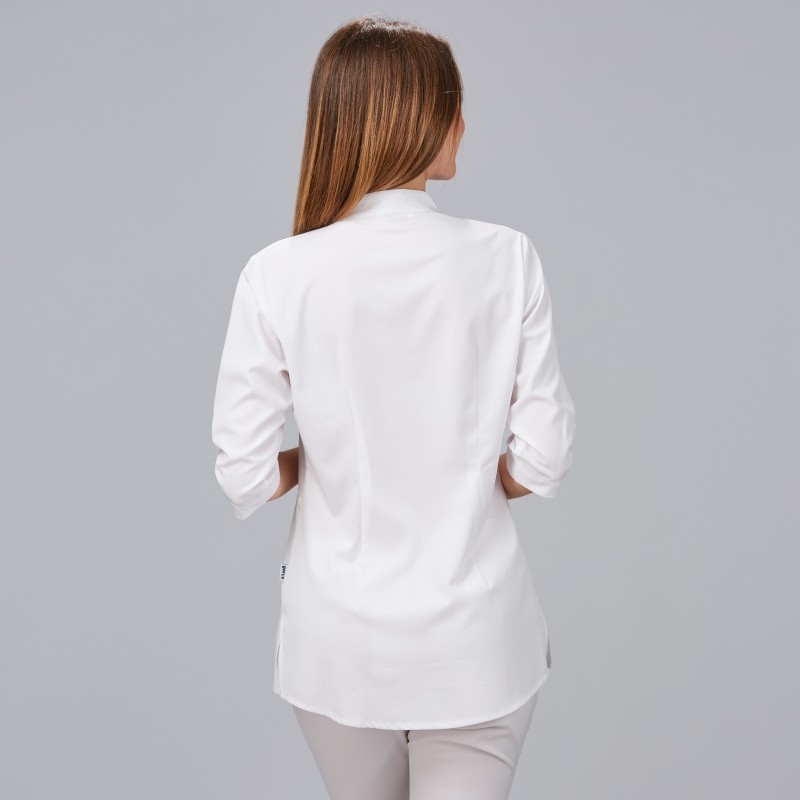 Blusa sanitaria para mujer con tejido elástico 360º y tratamiento SILVADUR con iones de plata para frescura prolongada. Corte semi ajustado, cuello redondo, mangas cortas con abertura y botones de presión ocultos. Dos bolsillos laterales para utensilios. Ideal para peluquería, estética y spa.