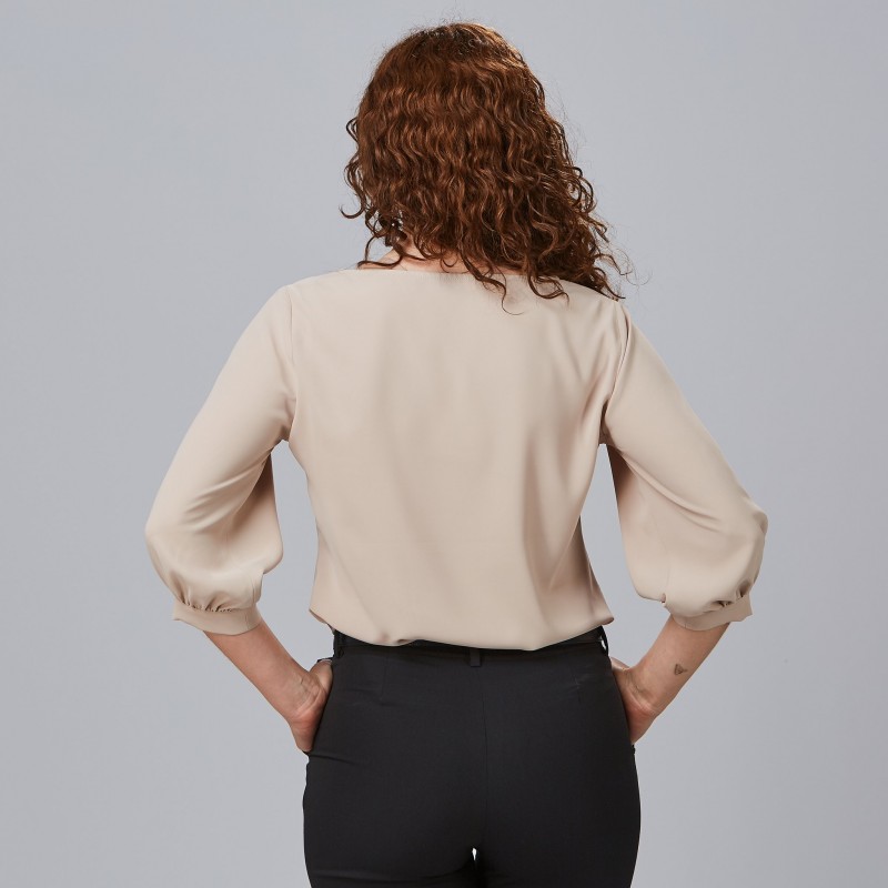 Blusa profesional de mujer con diseño holgado y manga regulable para un estilo versátil y cómodo en el trabajo. Tejido Breeze plano ligero y suave que facilita el mantenimiento diario y resiste las arrugas. Corte holgado M3 con caída favorecedora, ideal para uniformidad en comercio y recepción.