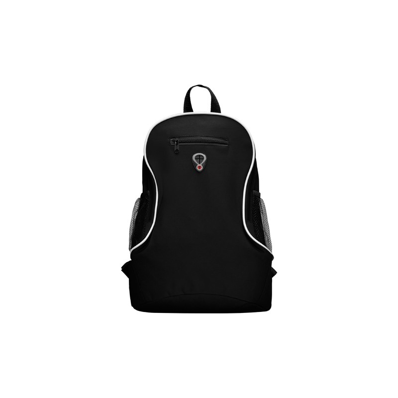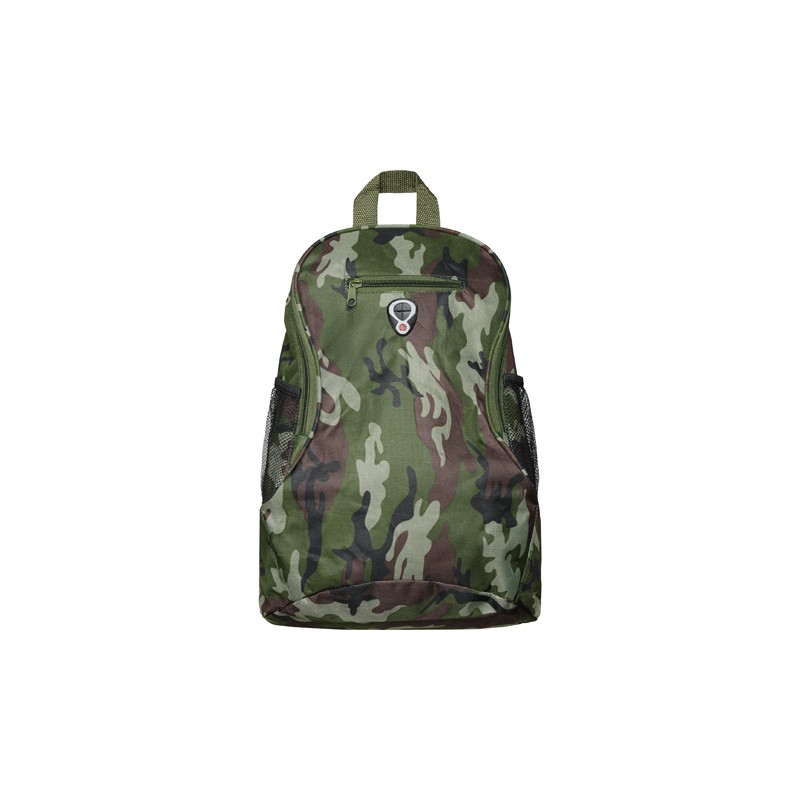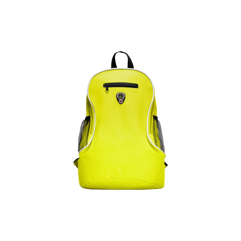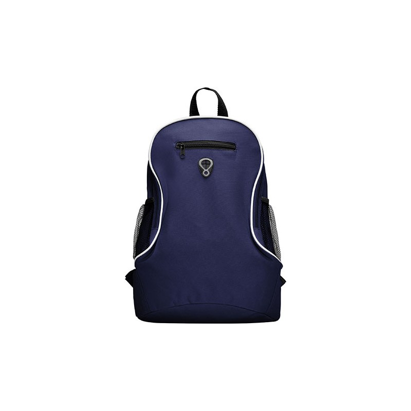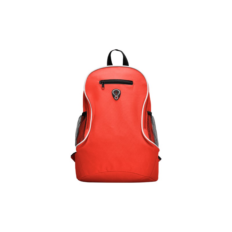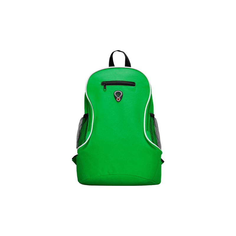 Mochila pequeña con asas ajustables, asa superior para colgar, bolsillo frontal con cremallera y bolsillos laterales en tejido microperforado.