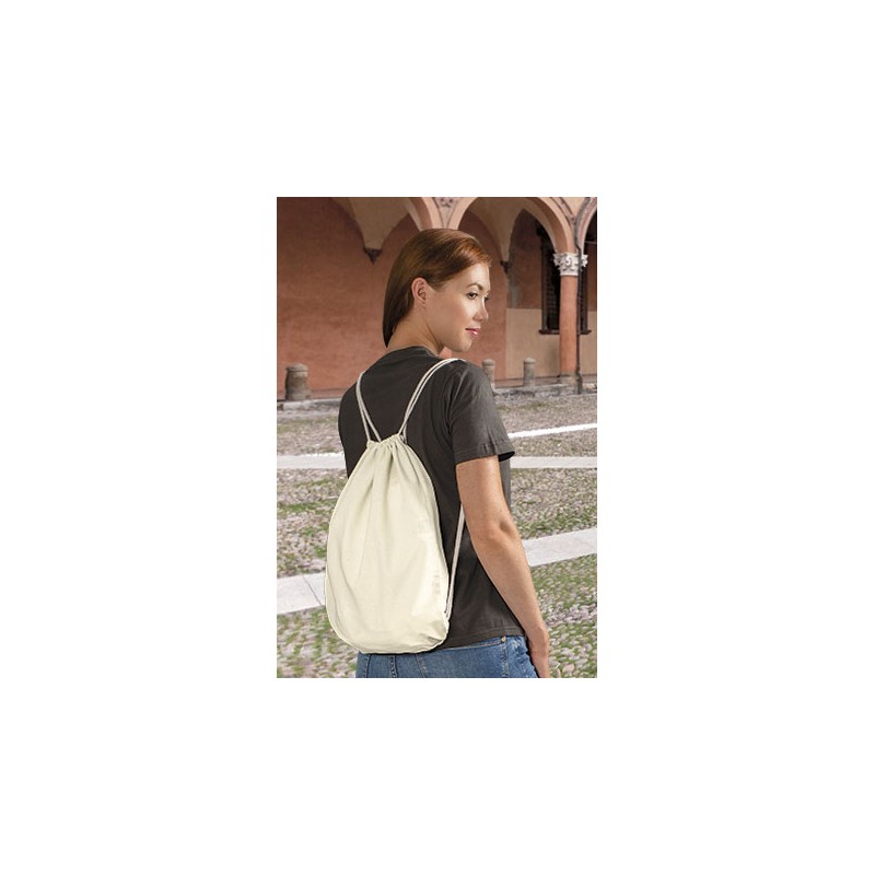 Bolsa/mochila con cordones, confeccionada en tejido 100% algodón natural, en color crudo, cierre superior mediante cordones de ajuste que sirven también como asas para llevar a la espalda.