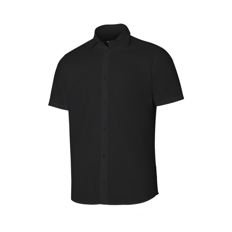 Chaqueta de cocina con cierre central con botones automáticos ocultos, cuello tipo mao, manga tipo sastre con abertura en puños y un bolsillo de parche en manga izquierda.