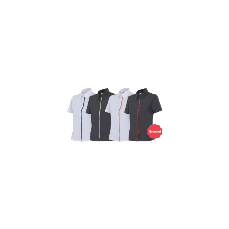 Camisa de mujer de manga corta, cierre central francés (sin tapeta), cuello francés, pinzas de entalle en pecho y espalda y botón de repuesto.