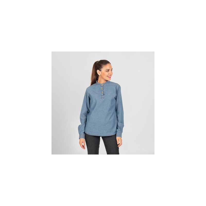 Camisa de mujer cerrada en manga larga, confeccionado en popelín tejano lavado que cuenta con pinzas en costados y espalda, puño abotonado y cuello cerrado mediante tres botones.