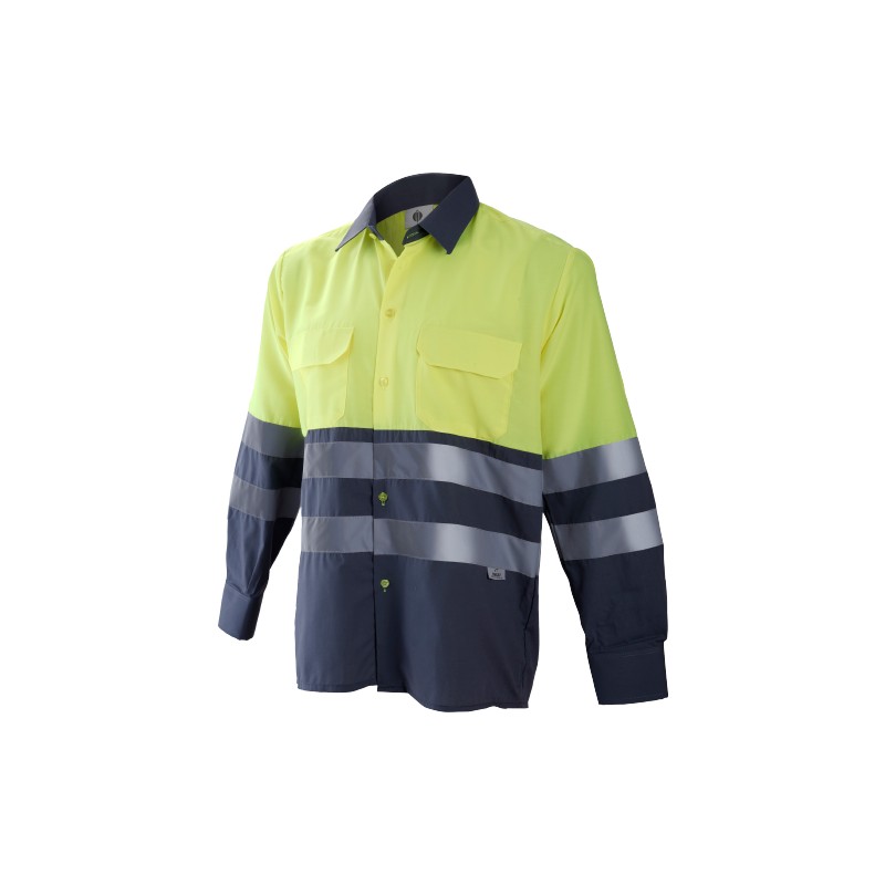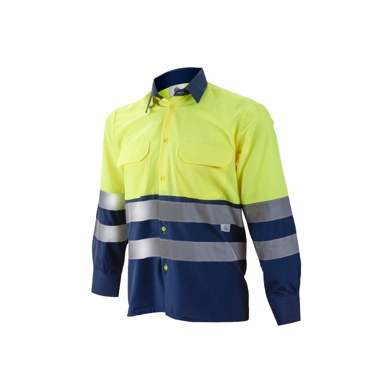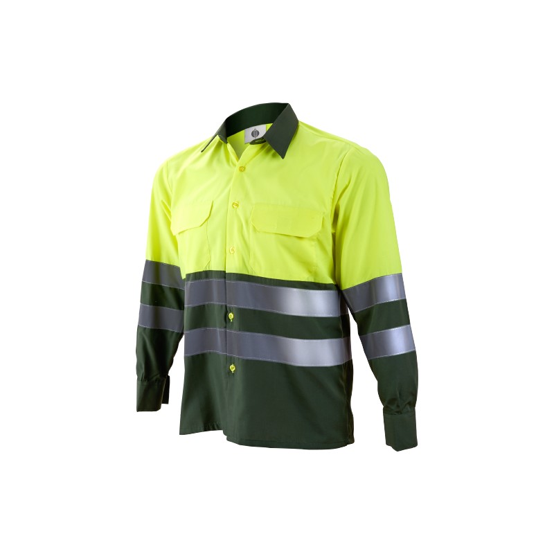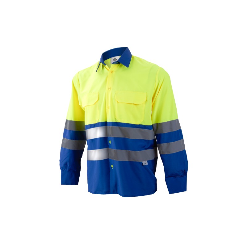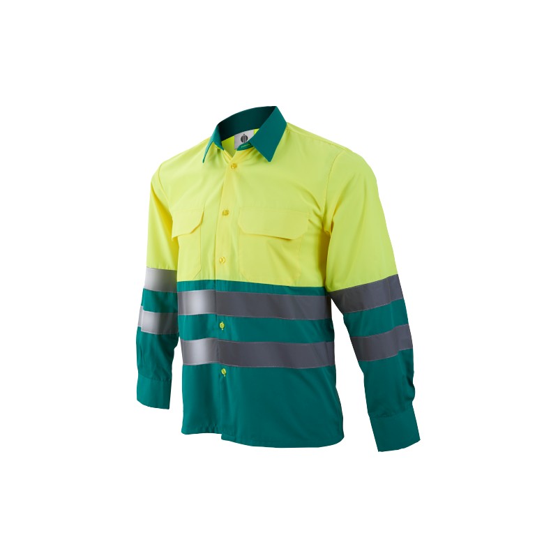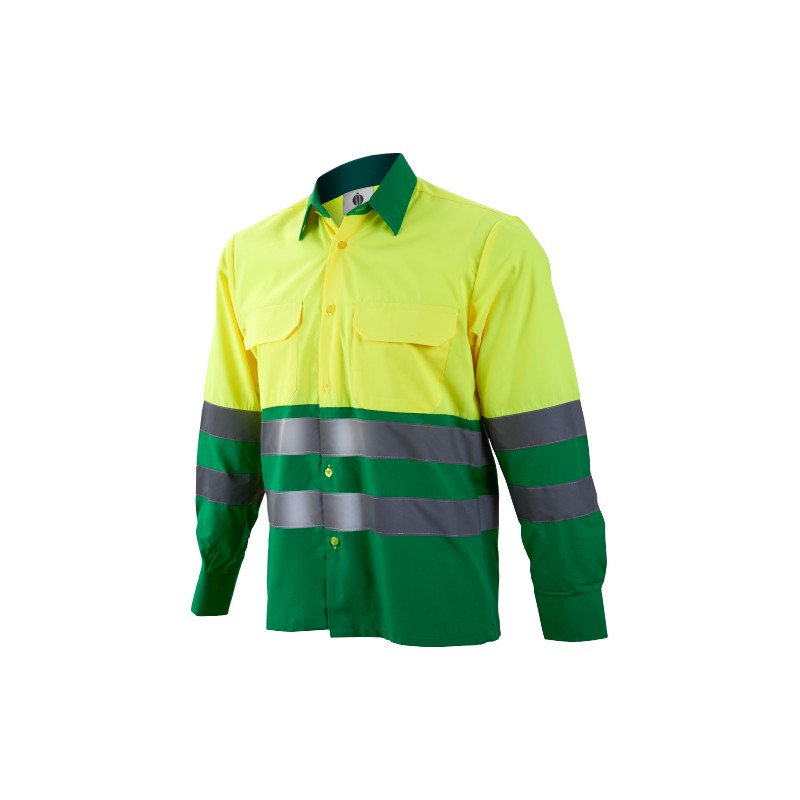Dos bolsillos en pecho con tapeta de cierre de velcro, cuello en mismo color que tejido de contraste, mitad superior tejido flúor, mitad inferior tejido contraste.