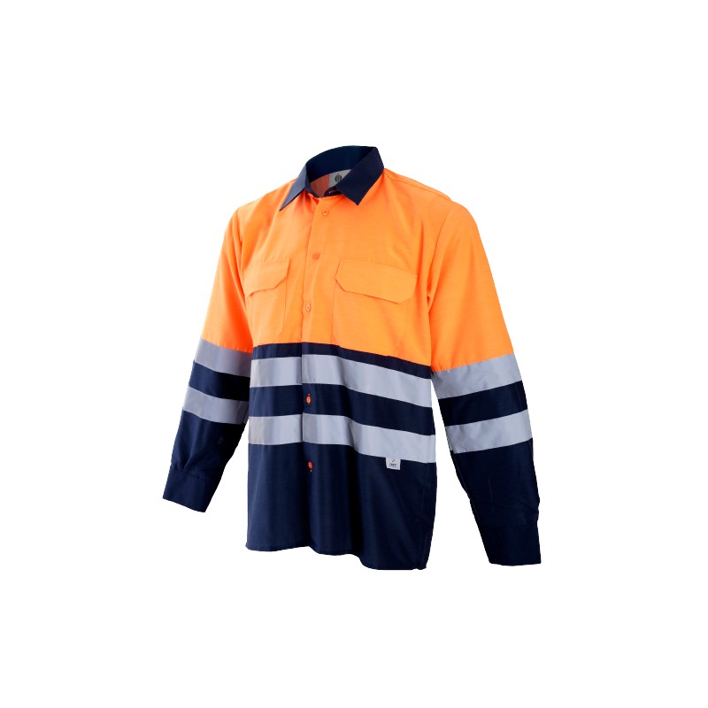 Dos bandas reflectantes horizontales en cuerpo de 5 cm de ancho y dos bandas reflectantes horizontales en mangas de 5 cm de ancho.