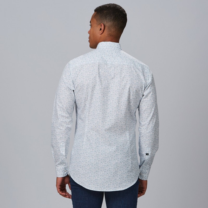 Camisa slim fit de hombre con cuello mao y manga larga para una imagen moderna y profesional. Popelín 100% Algodón de 115 g/m²: ligera, transpirable y de fácil cuidado. Estampado de banderas; pinzas y canesú en espalda; puño abotonado para un acabado pulido.