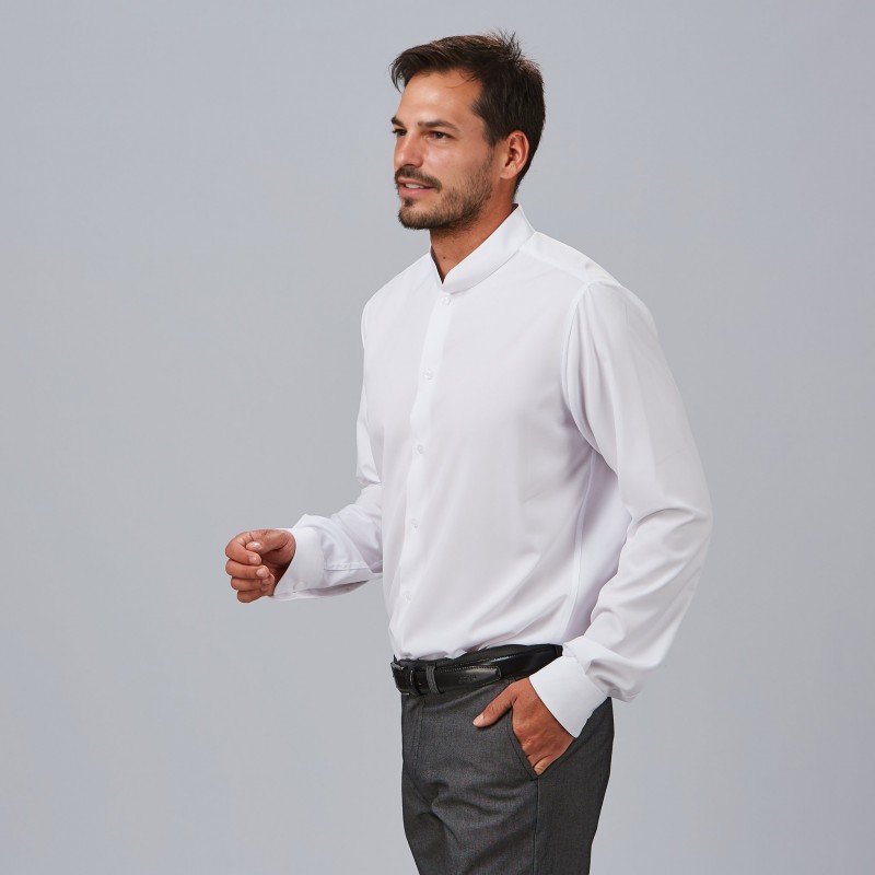 Camisa slim fit de hombre con cuello italiano para una imagen elegante y actual. Manga larga con puño abotonado, pinzas y canesú en espalda para un entalle impecable. Tejido Popelín Elysian elástico de fácil cuidado para uso profesional intensivo.