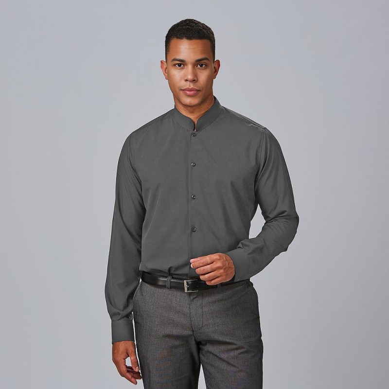 Camisa de hombre con cuello mao y corte slim fit para una imagen moderna y profesional. Tejido Interlock elástico que aporta suavidad, comodidad y fácil cuidado en uso intensivo. Manga larga con puño abotonado, pinzas y canesú en espalda para un entalle impecable.