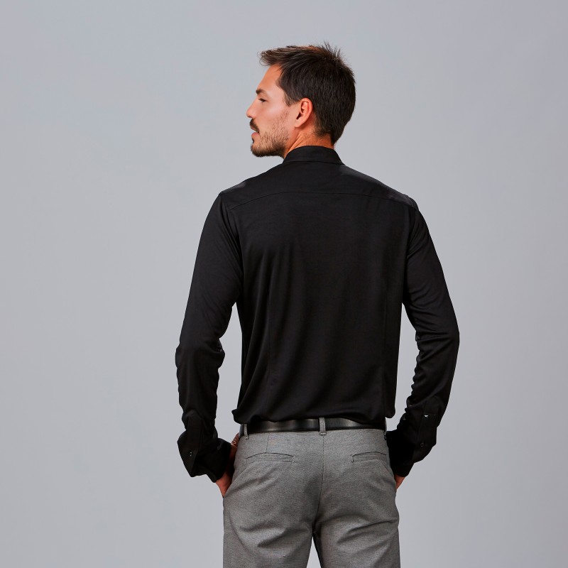 Camisa slim fit de hombre con cuello italiano para una imagen elegante y actual. Manga larga con puño abotonado, pinzas y canesú en espalda para un entalle impecable. Tejido Popelín Elysian elástico de fácil cuidado para uso profesional intensivo.