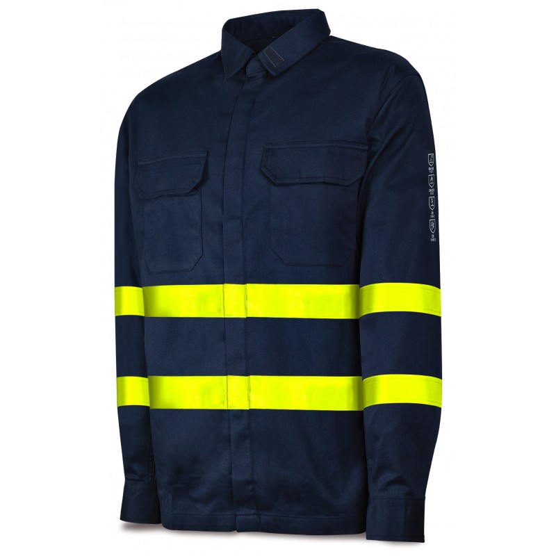 Camisa ignífuga y antiestática multinorma Marca PL 988CAIAV con cintas reflectantes de material combinado, indicada para calor y llama, soldeo y efectos térmicos del arco eléctrico.
