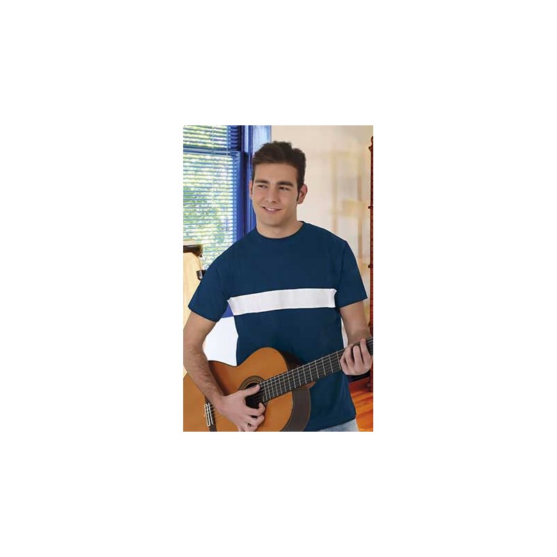 Camiseta bicolor, de corte clásico, confeccionada en tejido de punto liso 100% algodón ring spun, banda horizontal blanca (solo en la parte delantera del pecho) sobre cuerpo azul marino, cuello redondo de canalé y doble pespunte en cuello, bajo y mangas.