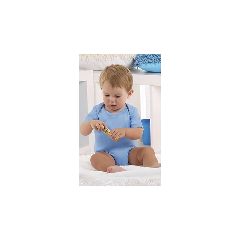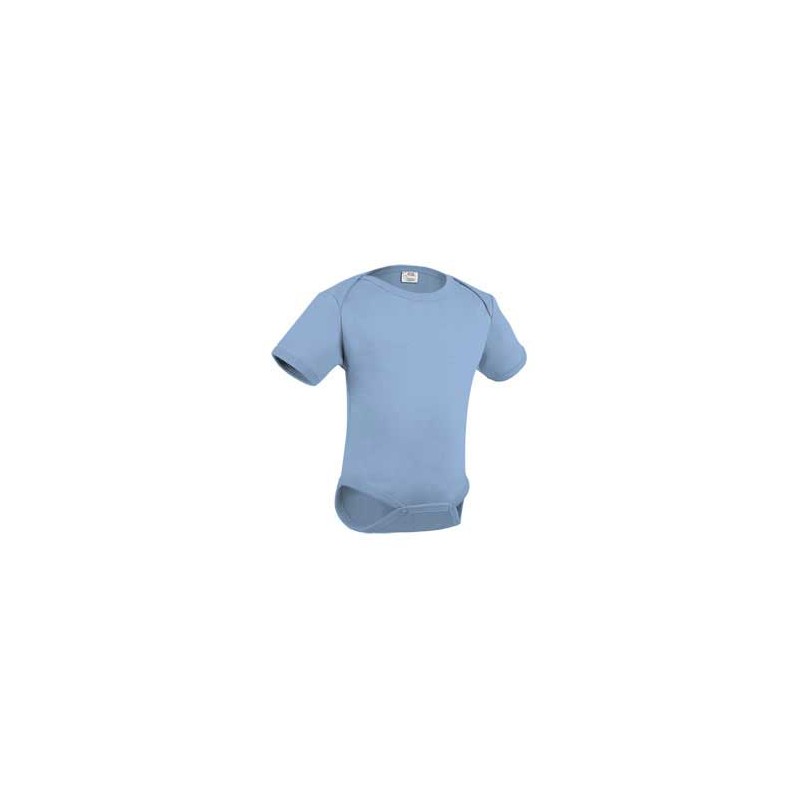 Body de bebé de manga corta, cómodo y resistente gracias a su confección en tejido doble interlock 100% algodón ring spun. Colores creados con tinte reactivo azofree. Cuello, bajo y mangas con costuras ribeteadas, cuello con hombros montados y bajo abierto con botones de presión para facilitar su colocación con el pañal.