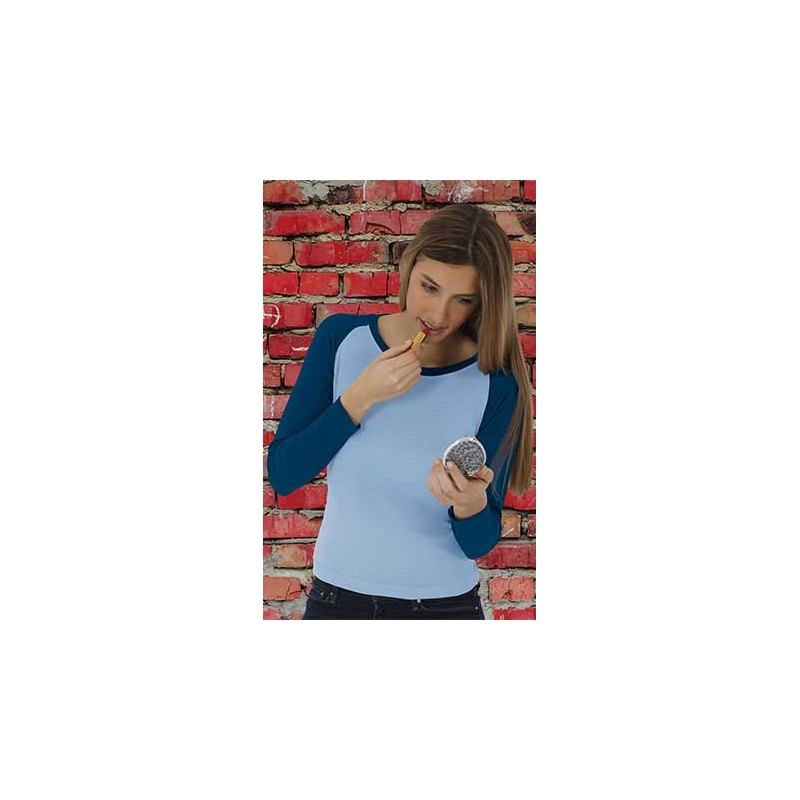 Camiseta de mujer con manga larga y dos colores combinados, confeccionada en tejido de canalé 1x1, manga larga ranglán y cuello redondo de canalé en diferente color a contraste. Doble pespunte en mangas sin puño.