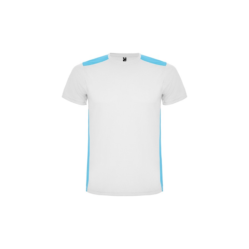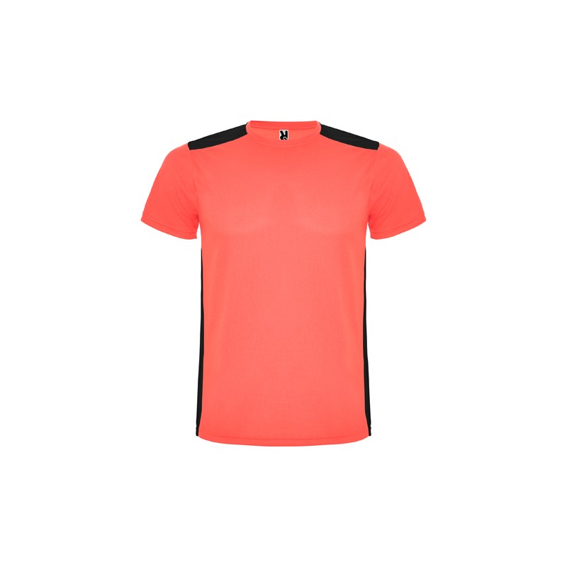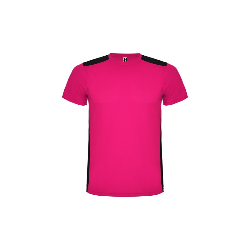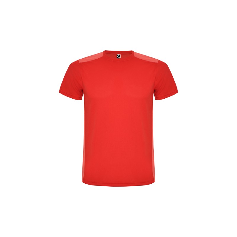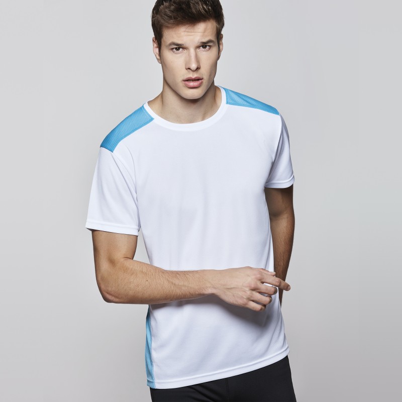 Camiseta técnica de manga corta, cuello redondo, combinada en espalda y hombros con dos tejidos de poliéster, tejido principal frontal nido de abeja y tejido rejilla 3D transpirable en la parte trasera, tejido preparado para la absorción de humedad y pespuntes decorativos zigzag en hombros y costados frontales. Patronaje en la espalda ligeramente mas largo.