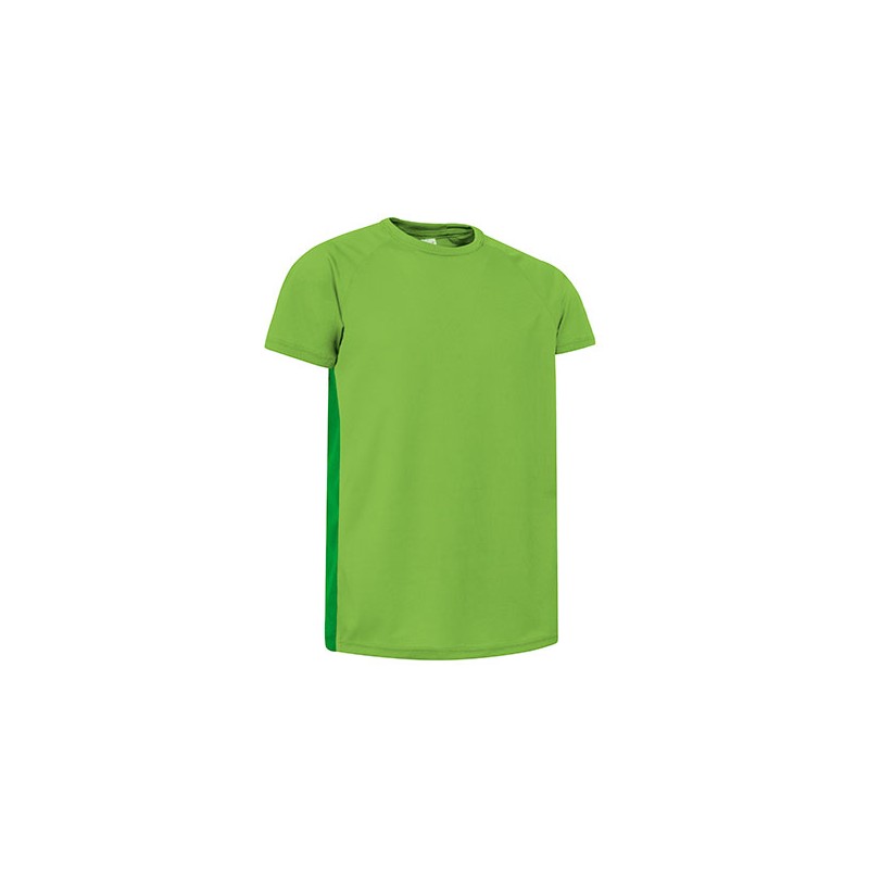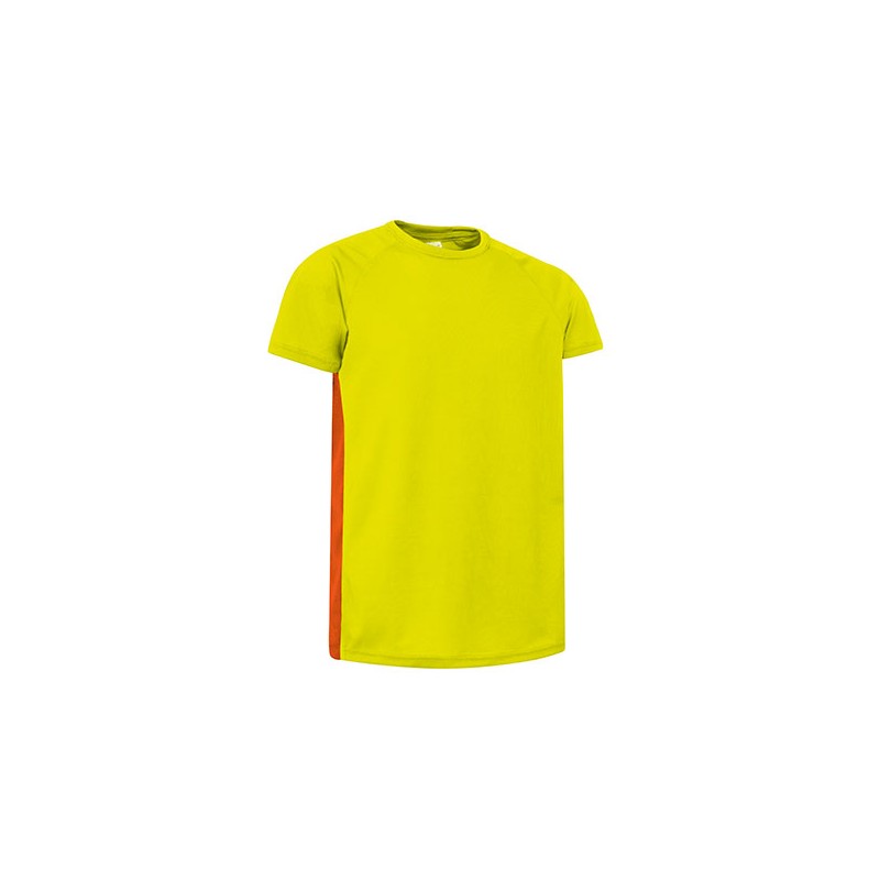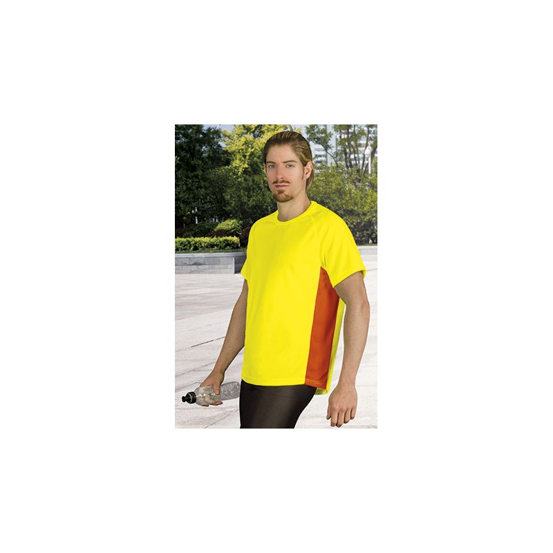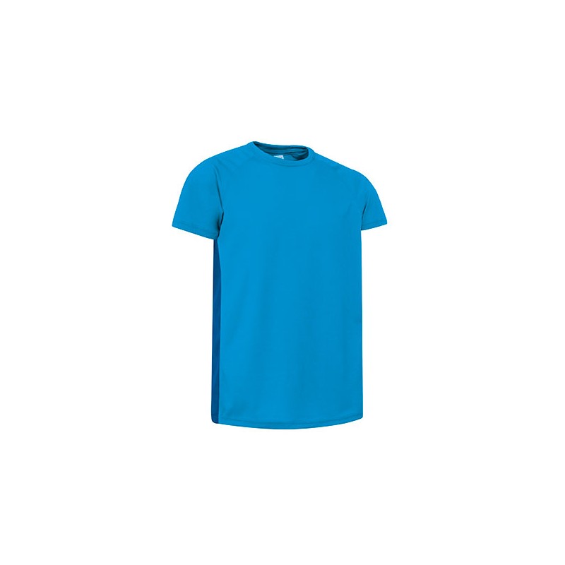 Camiseta ligera bicolor, especialmente preparada para hacer deporte por su confección en tejido técnico transpirable, que facilita la evacuación del sudor corporal.