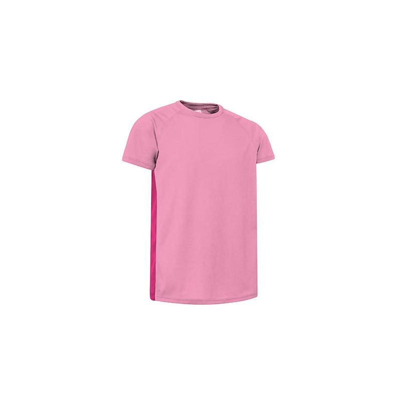 Camiseta ligera bicolor, especialmente preparada para hacer deporte por su confección en tejido técnico transpirable, que facilita la evacuación del sudor corporal, cuello redondo y manga corta con doble pespunte y costuras planas para evitar el roce al contacto con la piel.