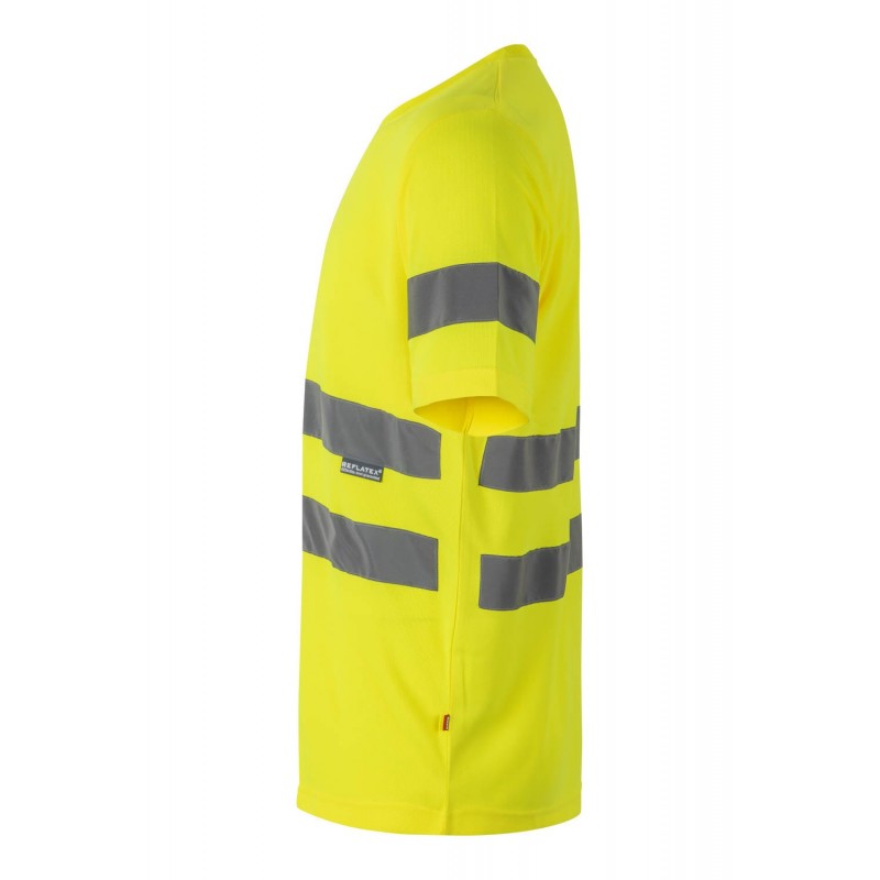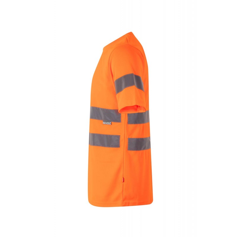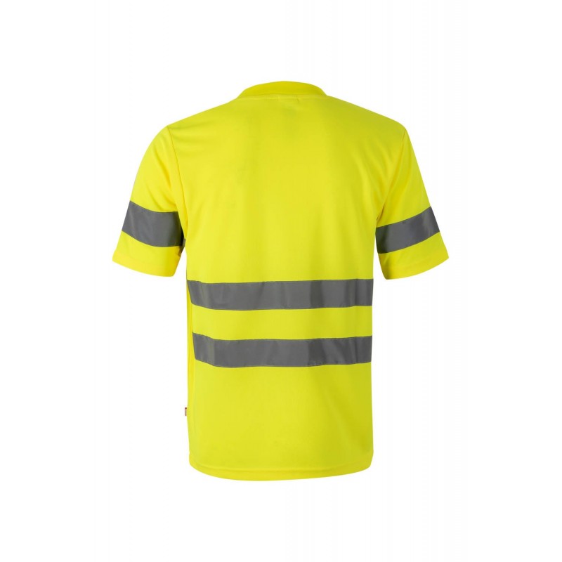 Camiseta técnica de Alta Visibilidad con cuello redondo de canalé, cubrecosturas con cinta de espiga y cintas reflectantes en torso y mangas.