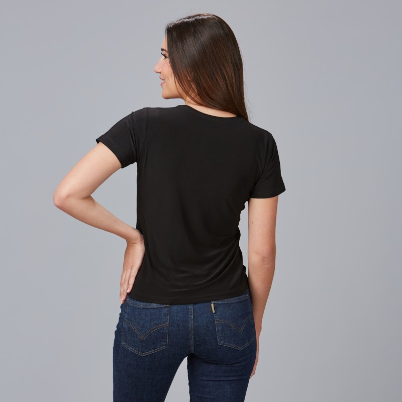 Esta camiseta clásica en manga corta y cuello redondo es la opción perfecta para lucir sofisticada en cualquier ocasión laboral.