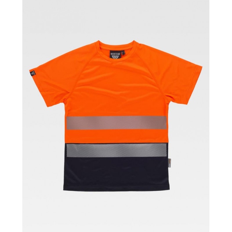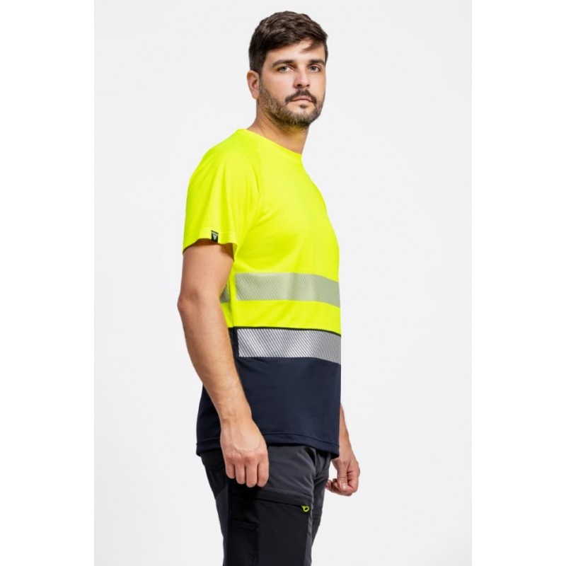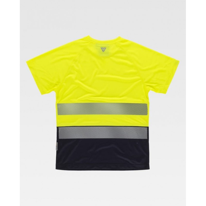 Camiseta de alta visibilidad de manga corta en poliéster micropiqué con cintas reflectantes segmentadas. Cuello redondo con cubrecosturas interior y mangas ranglán, con tejido técnico transpirable tratado con iones de plata para ayudar a reducir malos olores.