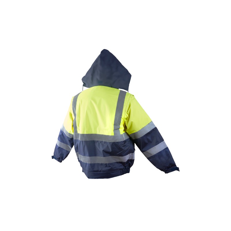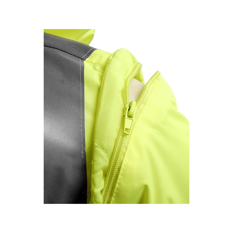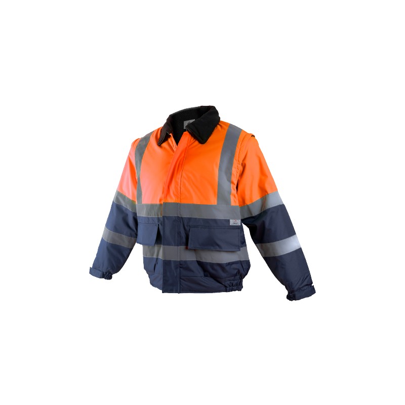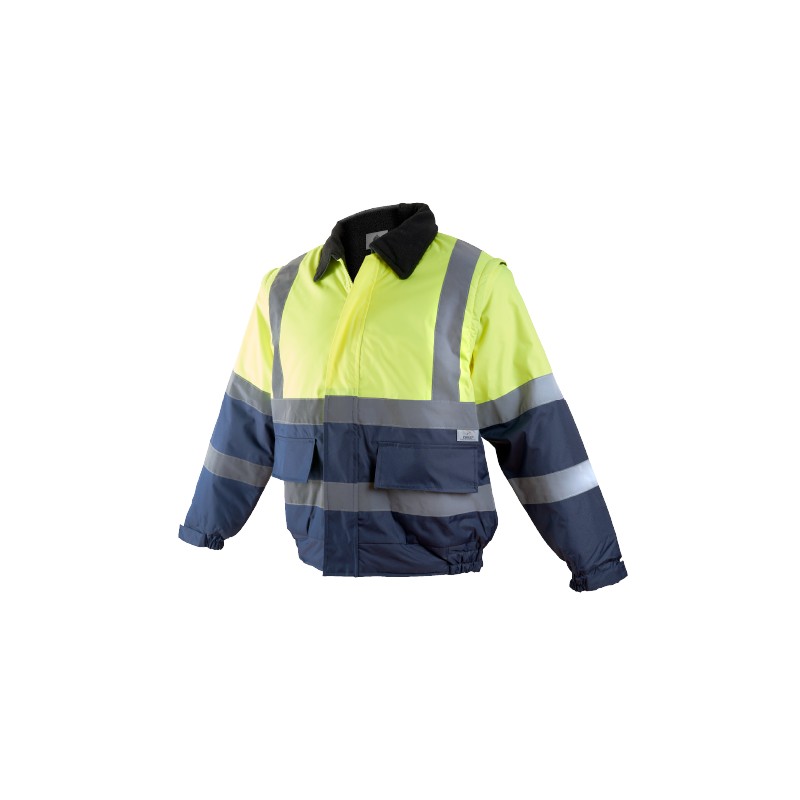 Cazadora bomber con cierre cremallera, cuello polar y acolchado, mangas desmontables impermeables, capucha impermeable oculta, dos bolsillos bajos grandes con tapeta y cierre velcro, un bolsillo interior con cremallera y portabolígrafos, mitad superior tejido flúor, mitad inferior tejido contraste.