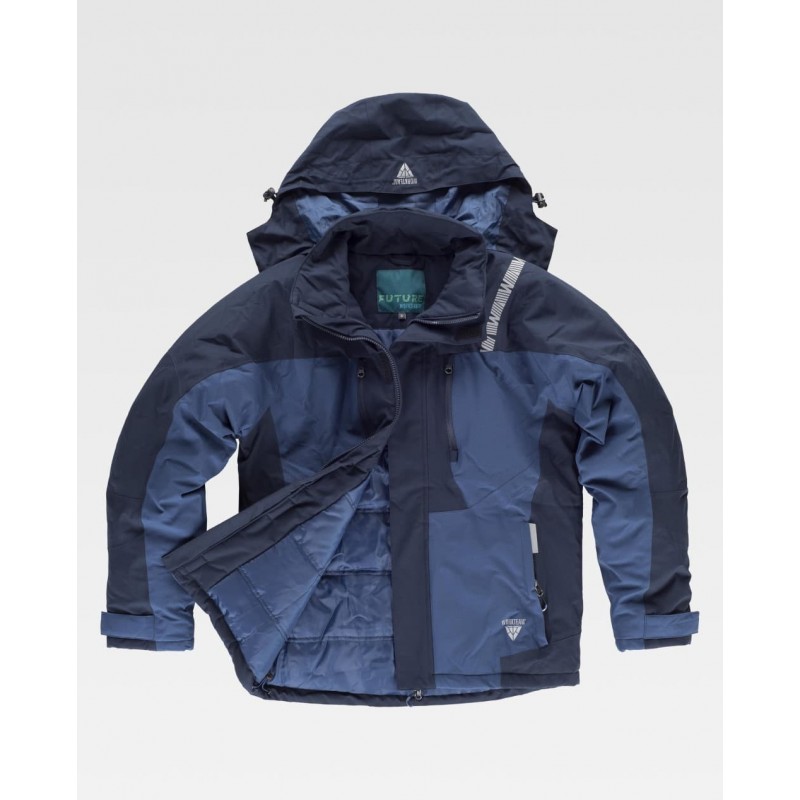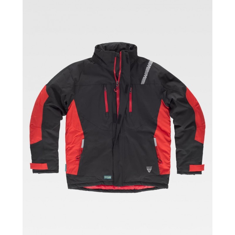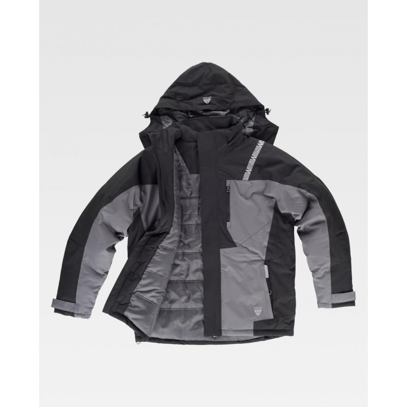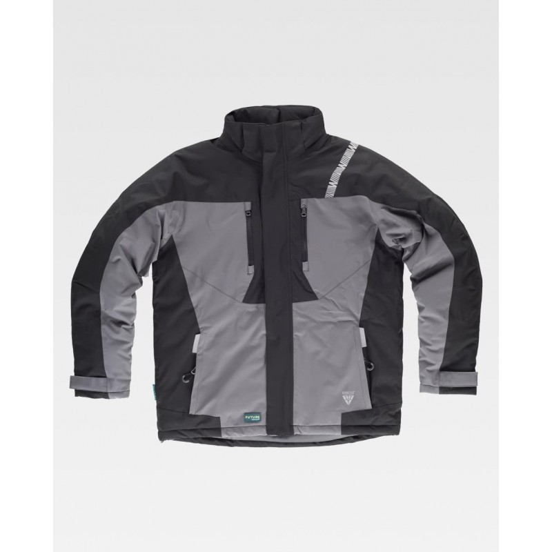 Chaqueta Workshell combinada con cuello alto y cierre de cremallera de nylon y solapa protectora interior vuelta en la parte superior cubriendo la cremallera.