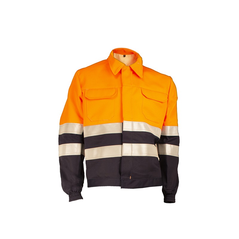 Cazadora CROMO Reflectante con cierre con cremallera y Velcro, alzacuellos con cierre de Velcro, puños y cintura elásticos, dos bolsillos superiores con tapeta y cierre de Velcro, cinta gris en contorno de pecho y mangas.