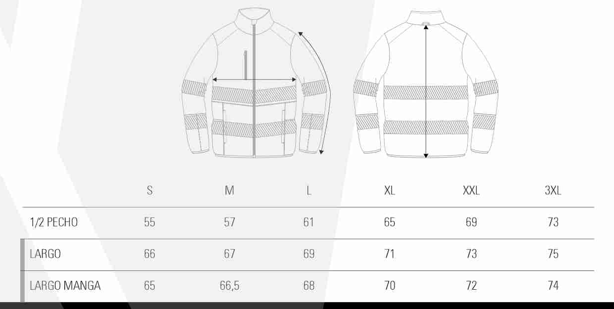 Un bolsillo en pecho interior con cierre de cremallera, dos bolsos laterales interiores con cierre de cremallera, dos cintas reflectantes segmentadas termoadhesivas en pecho, espalda y mangas.
