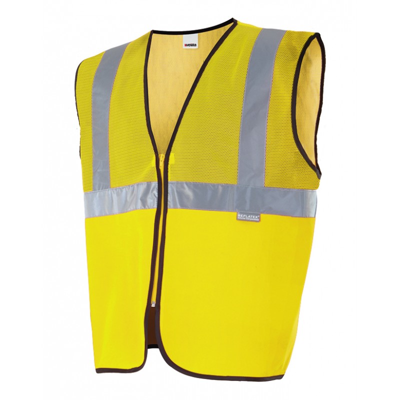 Polo bicolor manga corta alta visibilidad, manga corta, realizado en tejido transpirable, cintas reflectantes en el torso y hombros, cuello de canalé en color contraste con abertura central con botones.