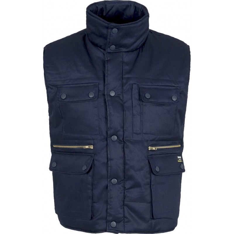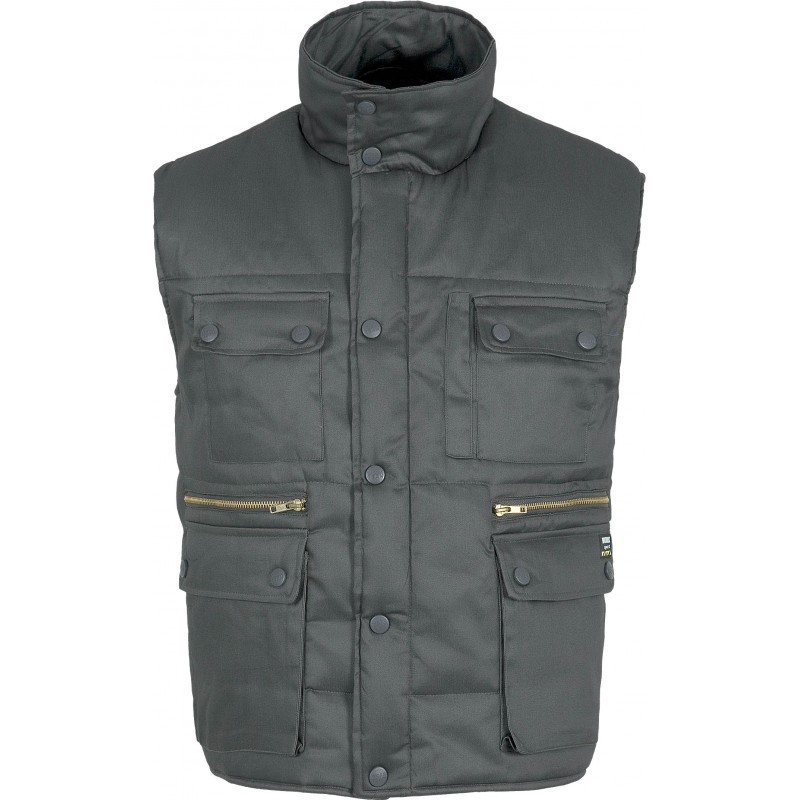 Chaleco con cierre de cremallera de metal oculta y corchetes, cuello alto, sisas ajustables, dos bolsillos de pecho con carteras de corchete, dos bolsillos interiores con cremallera de metal, dos bolsillos laterales con carteras de corchete, acolchado y elástico en cintura.