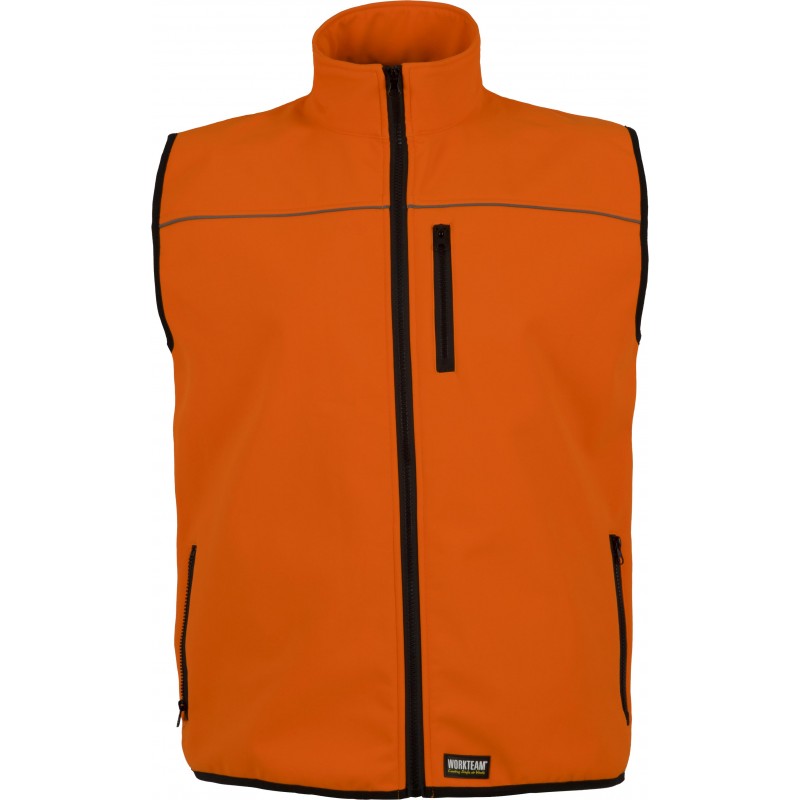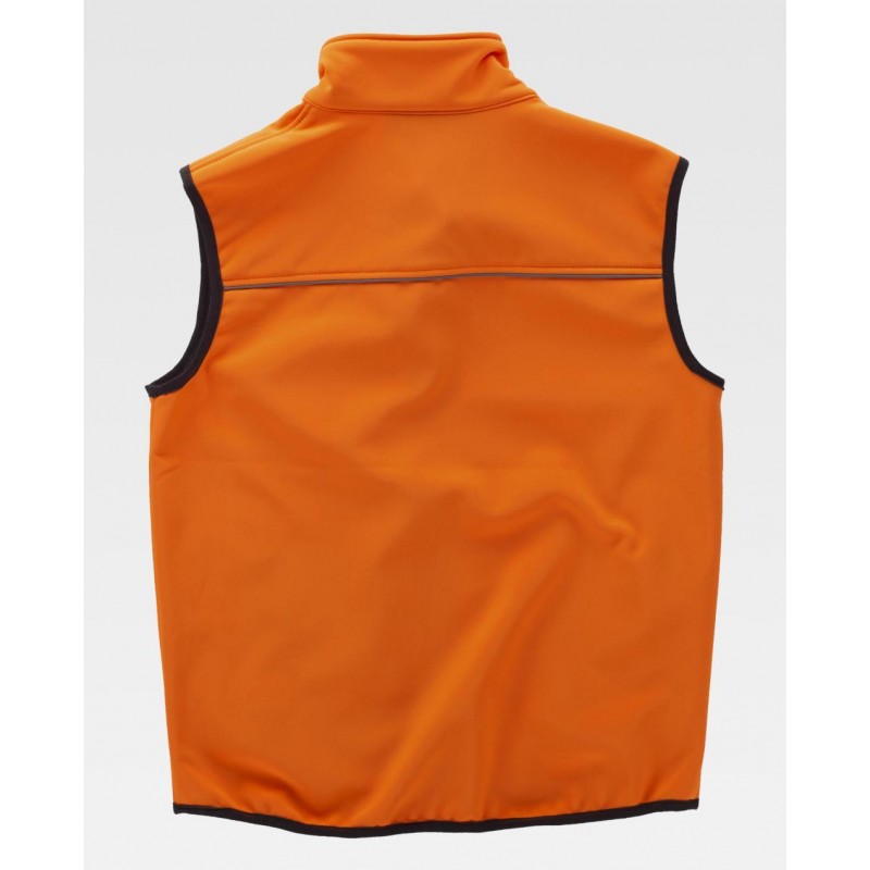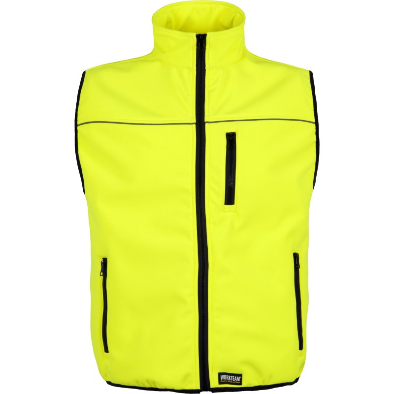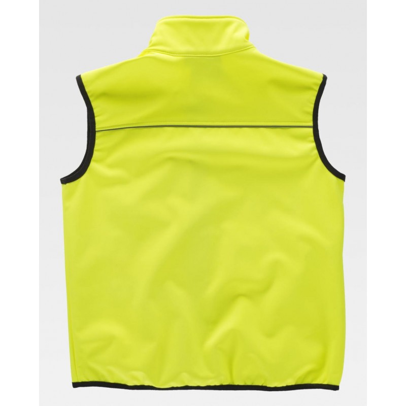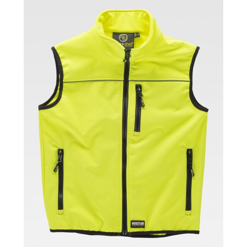 Chaleco Workshell de alta visibilidad con canesús, cuello alto, cierre de cremallera de nylon, un bolso de pecho y dos laterales interiores con cierre de cremallera de nylon, un bolso de plastón con cierre de cremallera en el interior y vivos reflectantes.