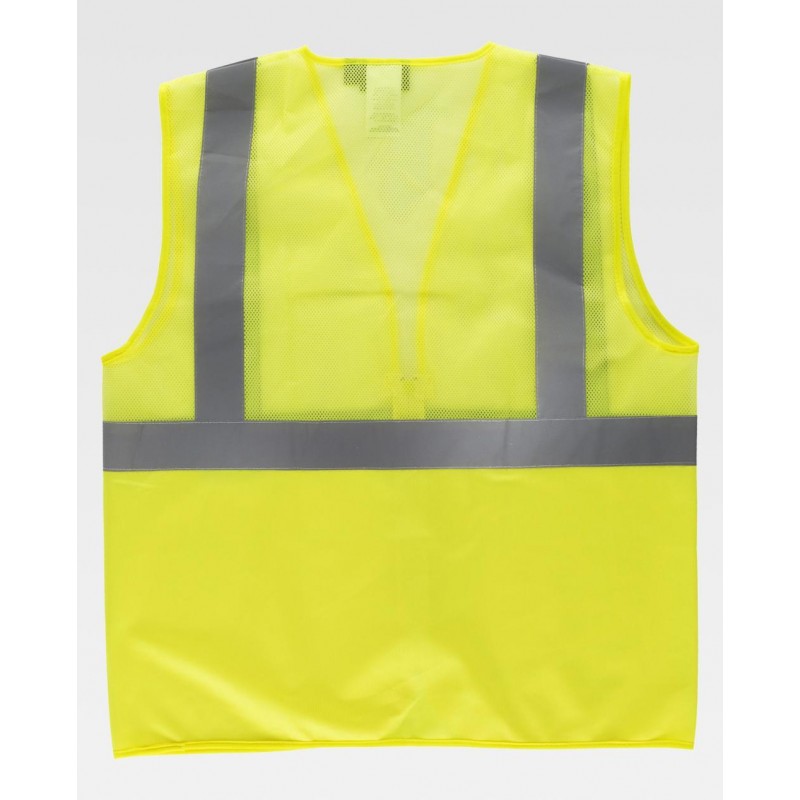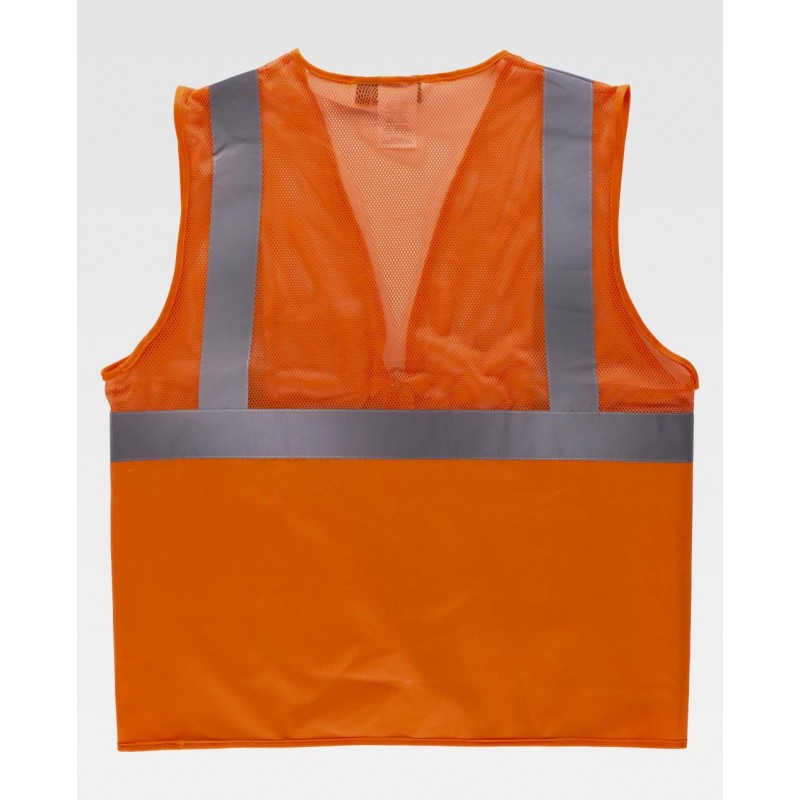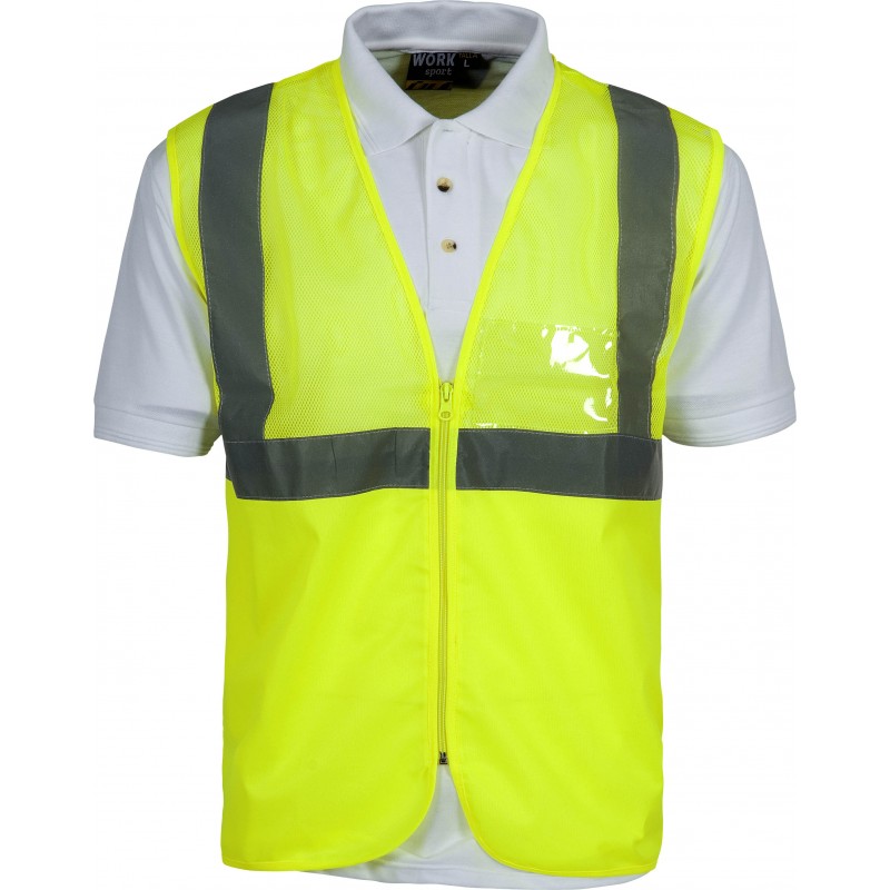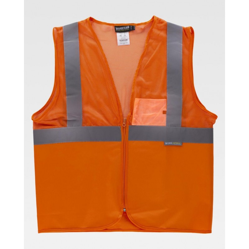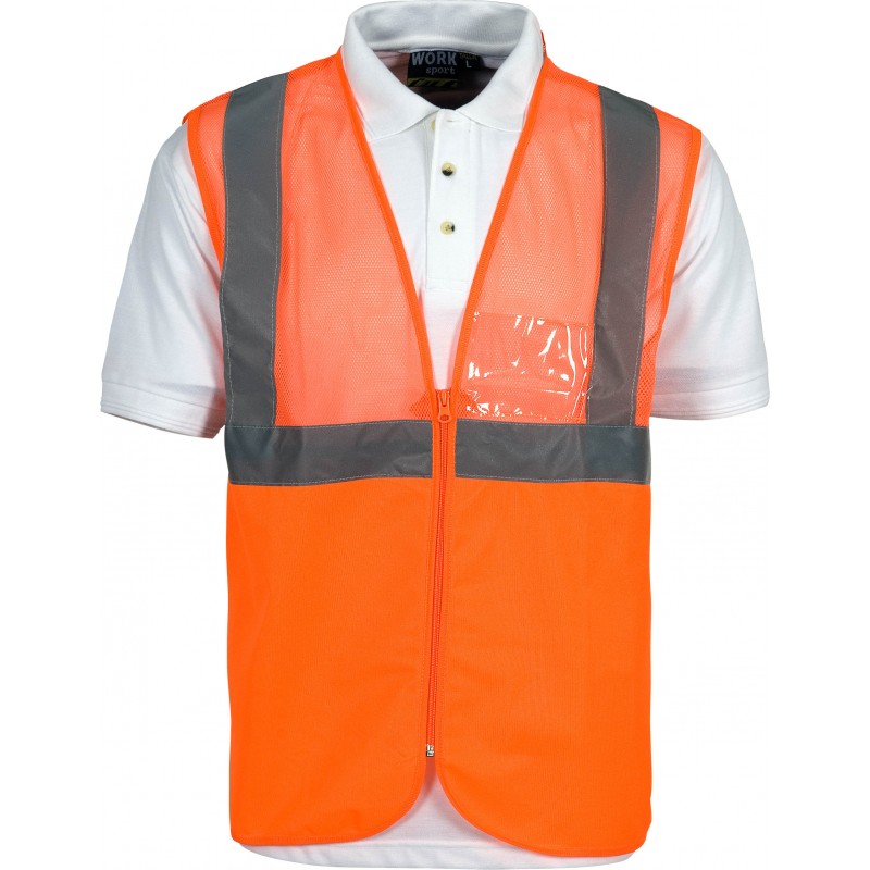Chaleco de alta visibilidad con cintas reflectantes, parte superior de rejilla, escote a pico, cierre de cremallera de nylon, un bolsillo de pecho transparente para identificador personal, una cinta reflectante en hombros, pecho y espalda y ribeteado con bies.
