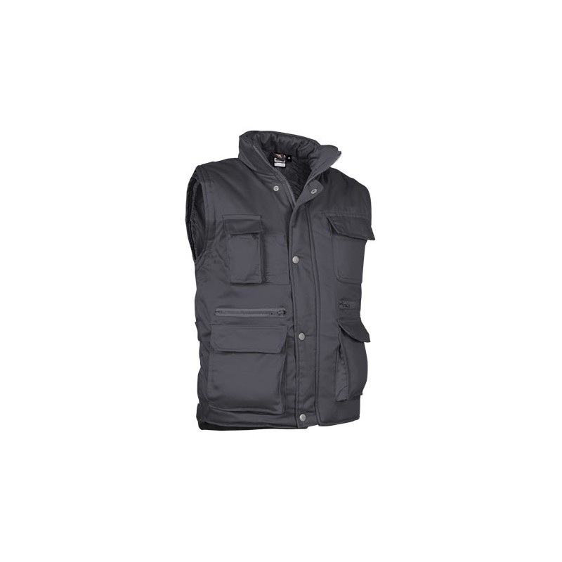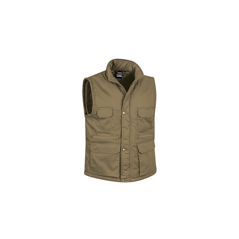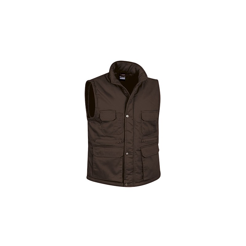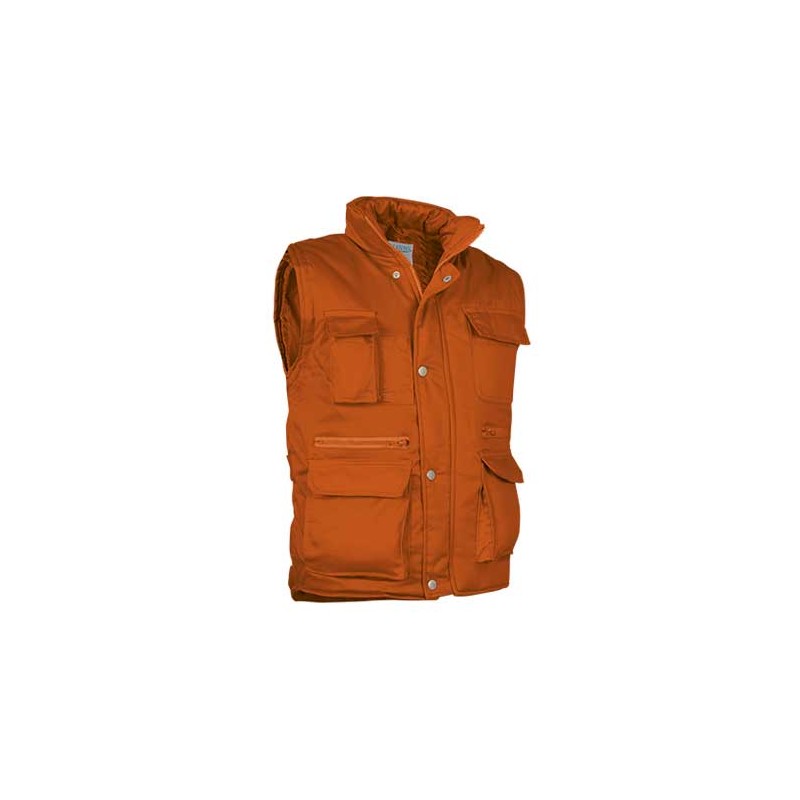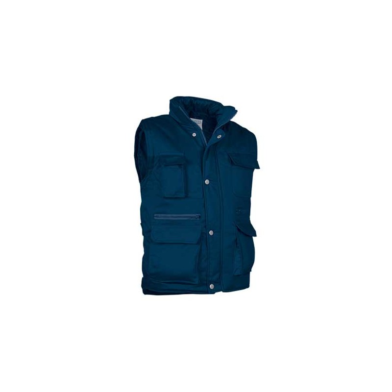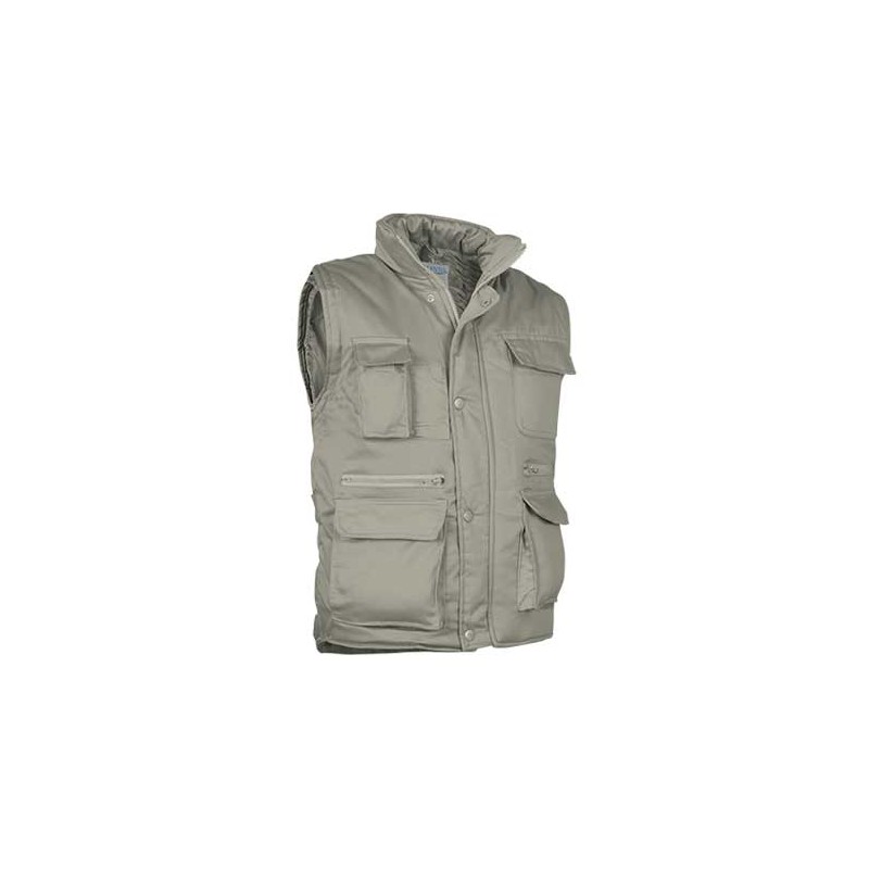 Chaleco multibolsillos confeccionado en tejido de sarga con relleno acolchado y forro interior, cuello alto y cremallera frontal entera, 8 bolsillos en la cara exterior incluyendo dos departamentos para bolígrafo y un bolsillo para el teléfono móvil.