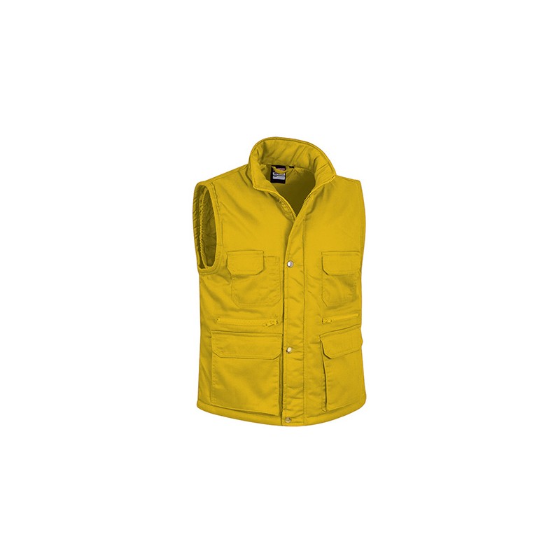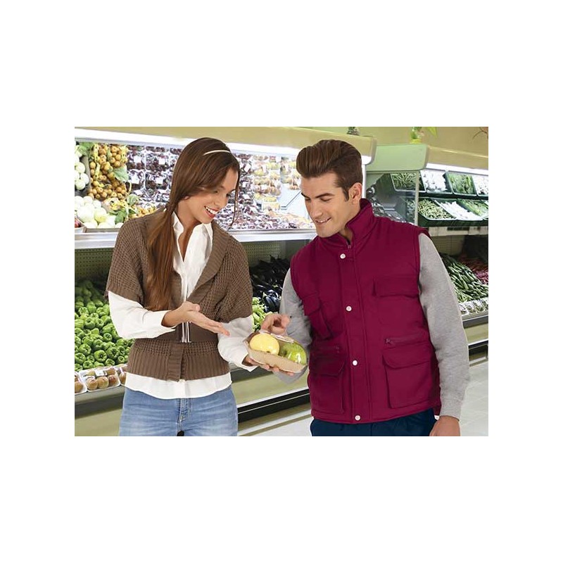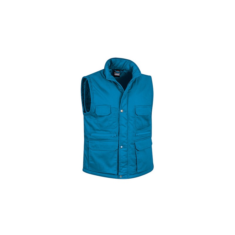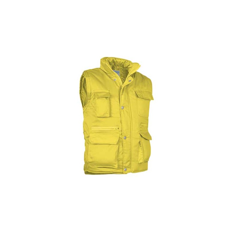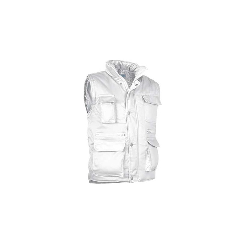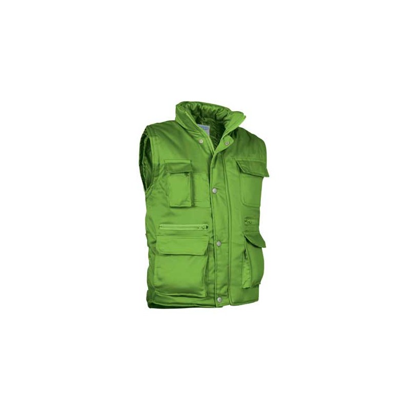 Chaleco multibolsillos confeccionado en tejido de sarga con relleno acolchado y forro interior, cuello alto y cremallera frontal entera, 8 bolsillos en la cara exterior incluyendo dos departamentos para bolígrafo y un bolsillo para el teléfono móvil.