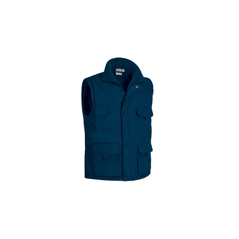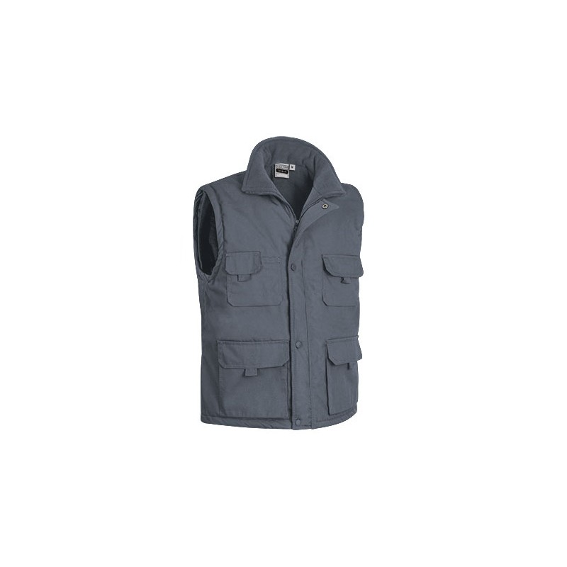 Chaleco multibolsillos confeccionado en tejido canvas con relleno acolchado y forro interior en tejido polar antipeeling que le aporta mayor efecto calórico, tapeta con broches a presión sobre la cremallera frontal.