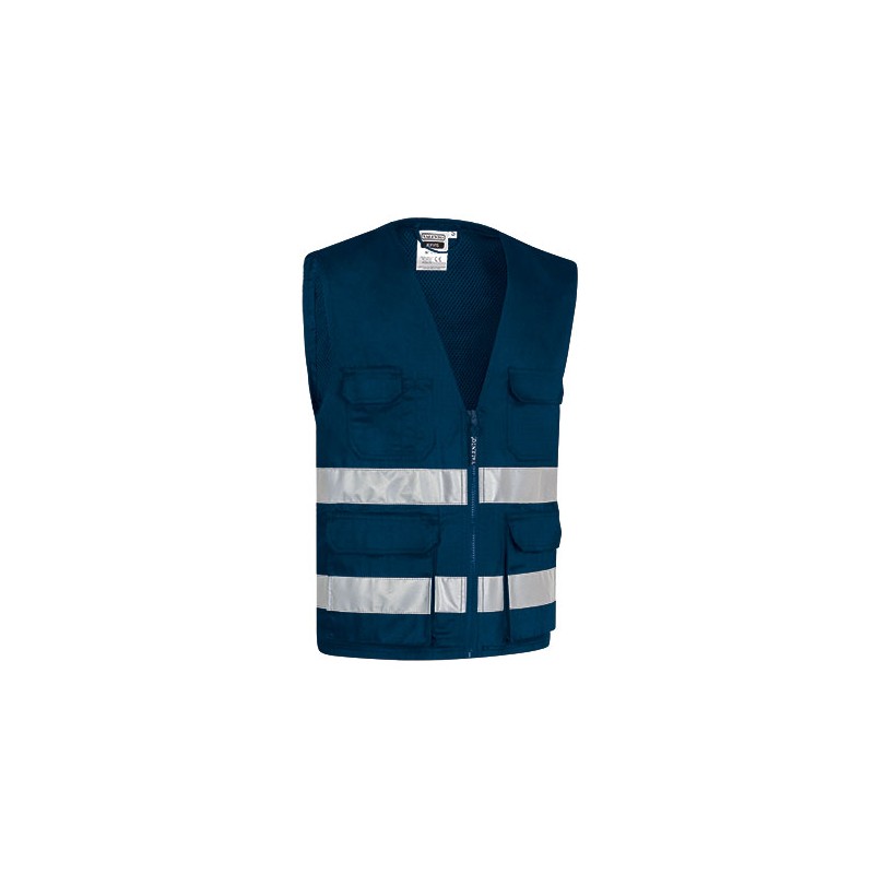 Chaleco multibolsillos de visibilidad realzada, confeccionado en sarga y resistente, con dos bandas retrorreflectantes. Cuello abierto y cierre frontal con cremallera. Rejilla en la cara interior de la espalda para favorecer la ventilación.