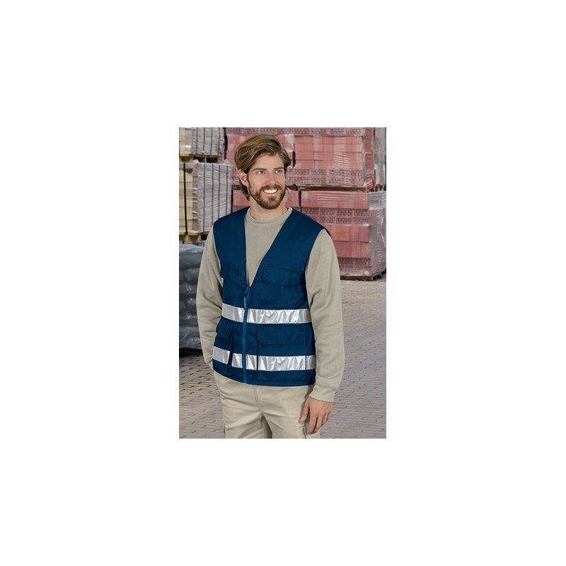 Chaleco multibolsillos de visibilidad realzada, confeccionado en sarga y resistente, con dos bandas retrorreflectantes.