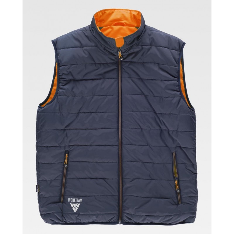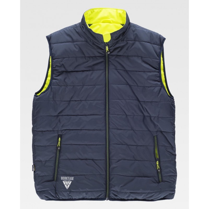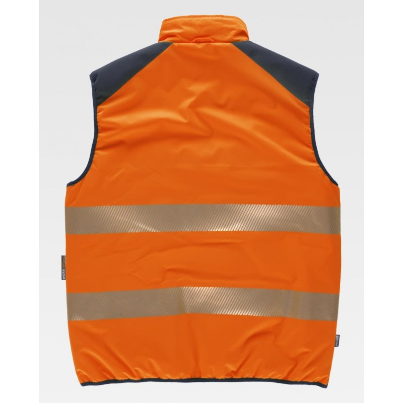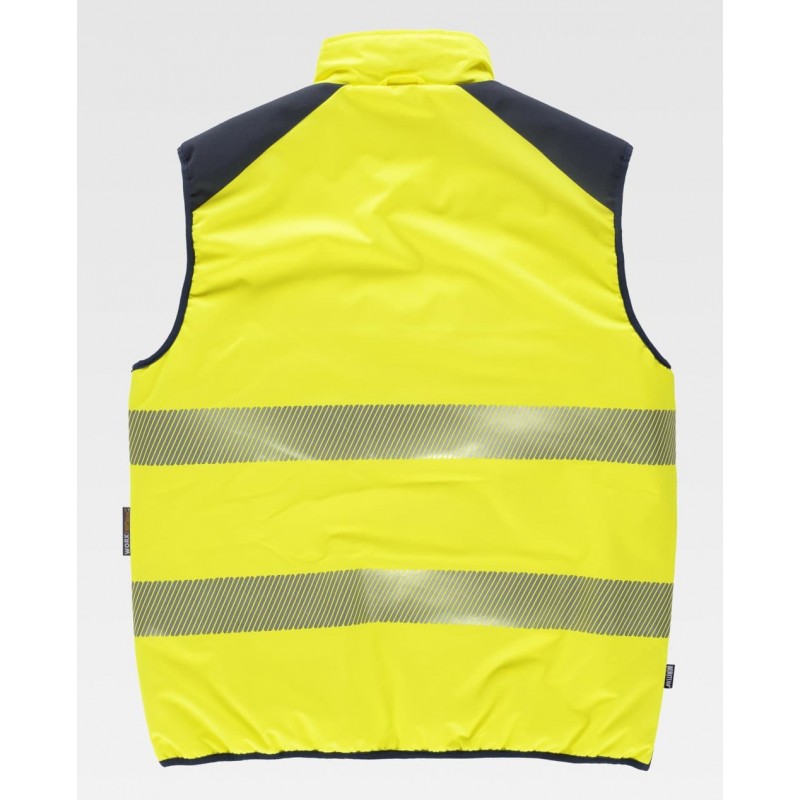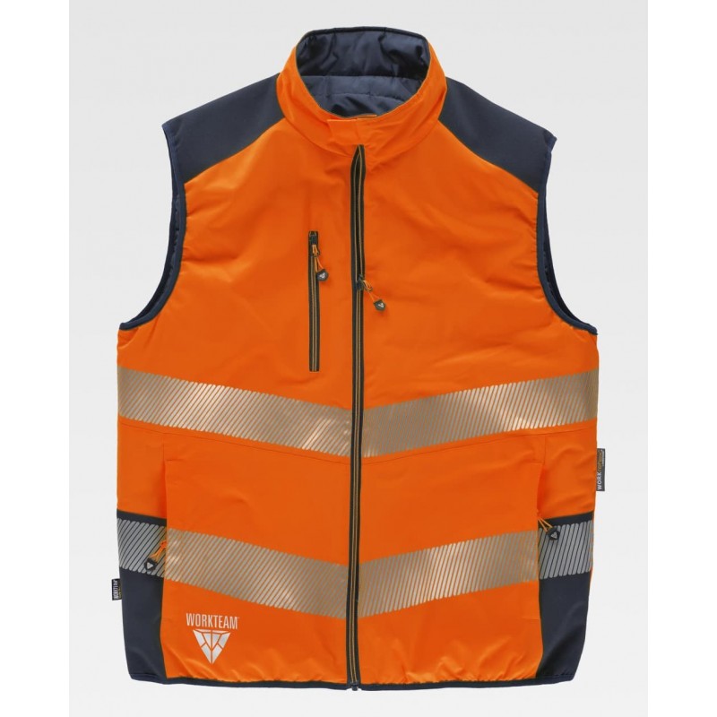 Cazadora de tejido elástico bidireccional por construcción combinada con cintas reflectantes segmentadas, cuello camisero y cierre de cremallera de nylon oculta por solapa postiza con velcro y refuerzo combinado en hombros.