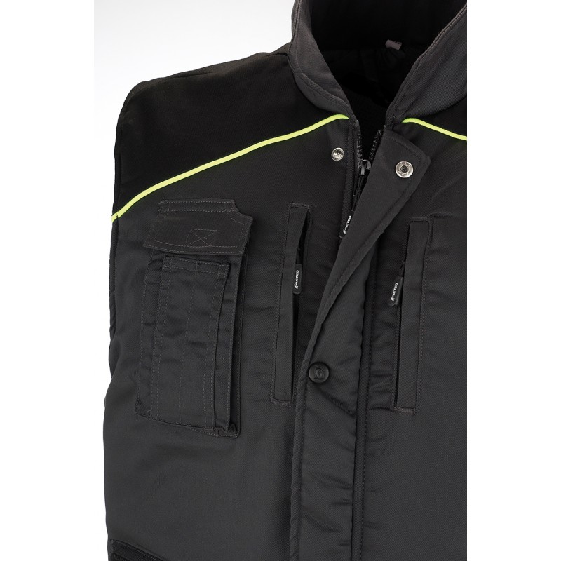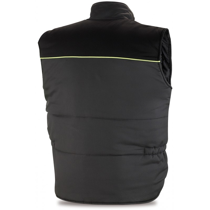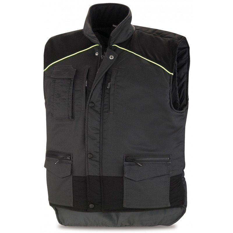 Chaleco stretch de color gris con contrastes en negro en zona inferior del panel frontal y hombros, con ribetes amarillo fluorescente.