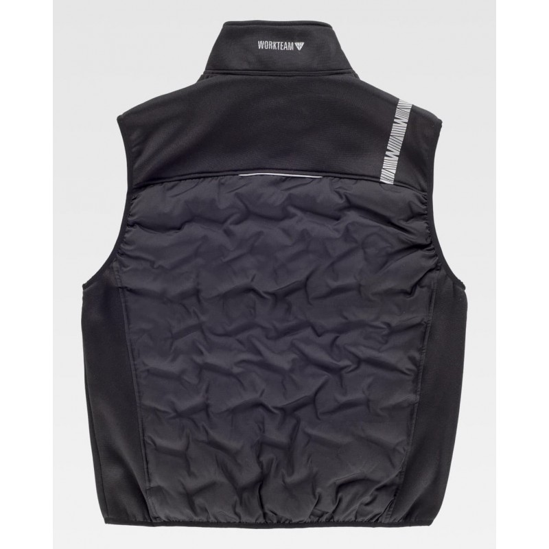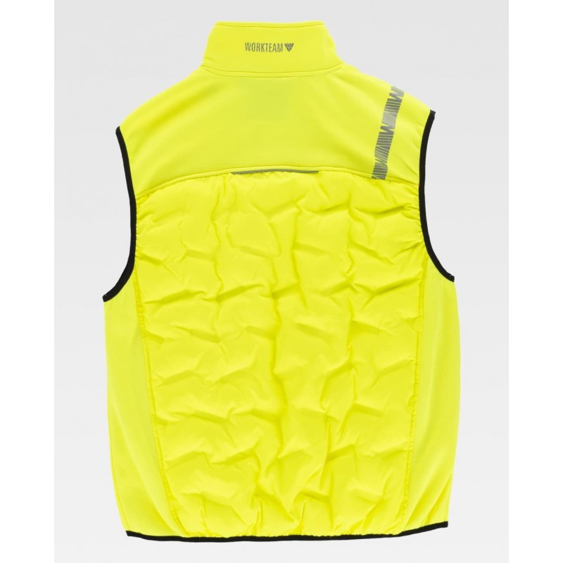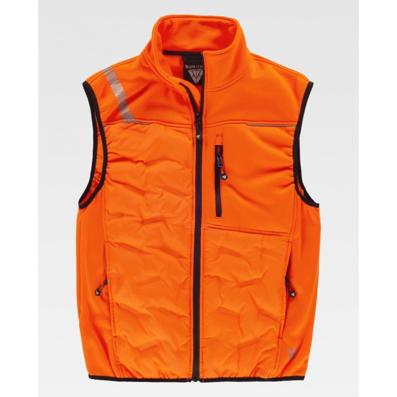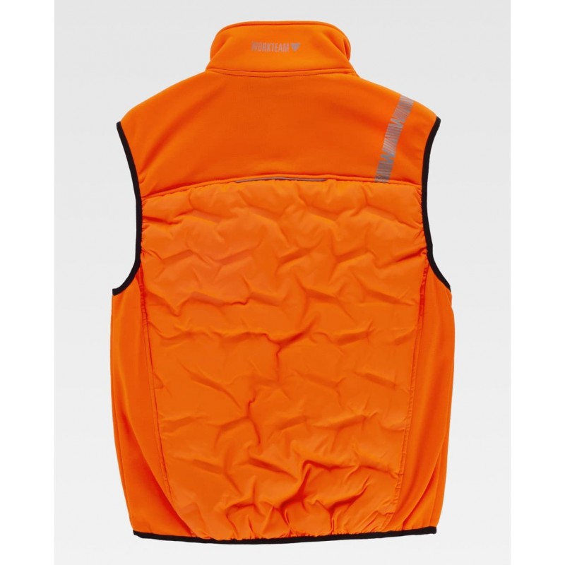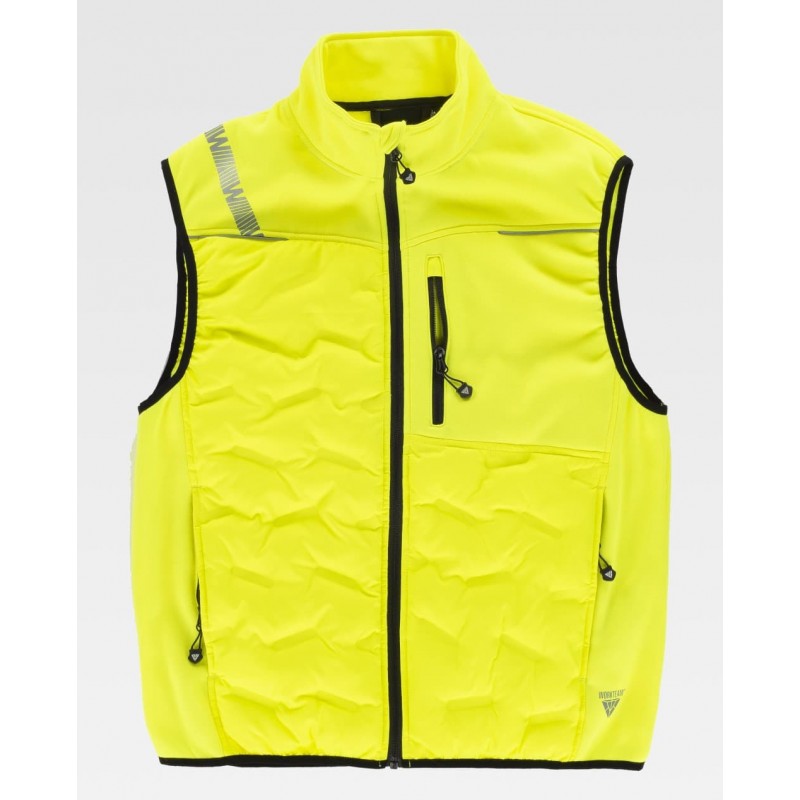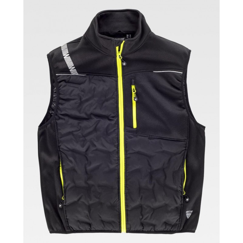 Chaqueta combinada con tejido acolchado sellado y con detalles reflectantes y cuello alto con cierre de cremallera de nylon. Solapa protectora interior vuelta en la parte superior cubriendo la cremallera y un bolso de pecho y dos laterales interiores con cierre de cremallera de nylon. Cinta reflectante decorativa personalizada en hombro y puños y bajo...
