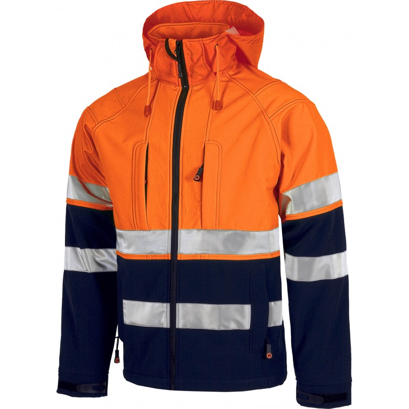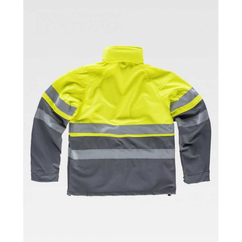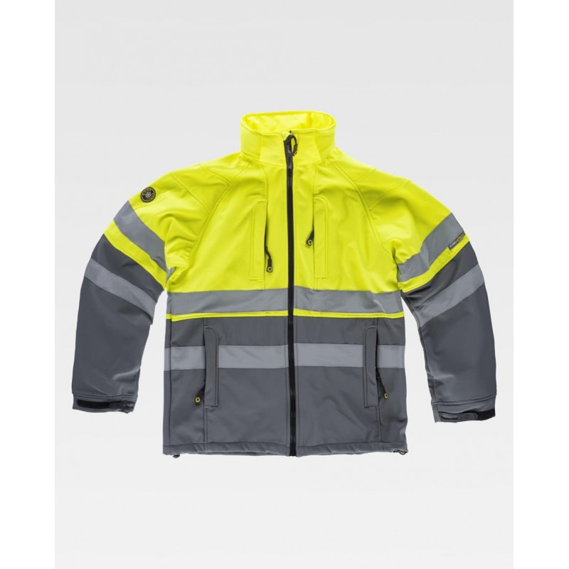 Chaqueta Workshell combinada con tejido acolchado con cuello alto con cierre de cremallera de nylon, solapa protectora interior vuelta en la parte superior cubriendo la cremallera y dos bolsos laterales interiores con cierre de cremallera.