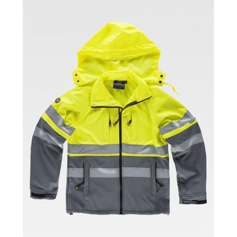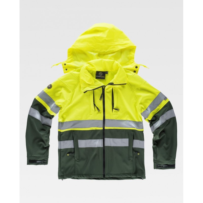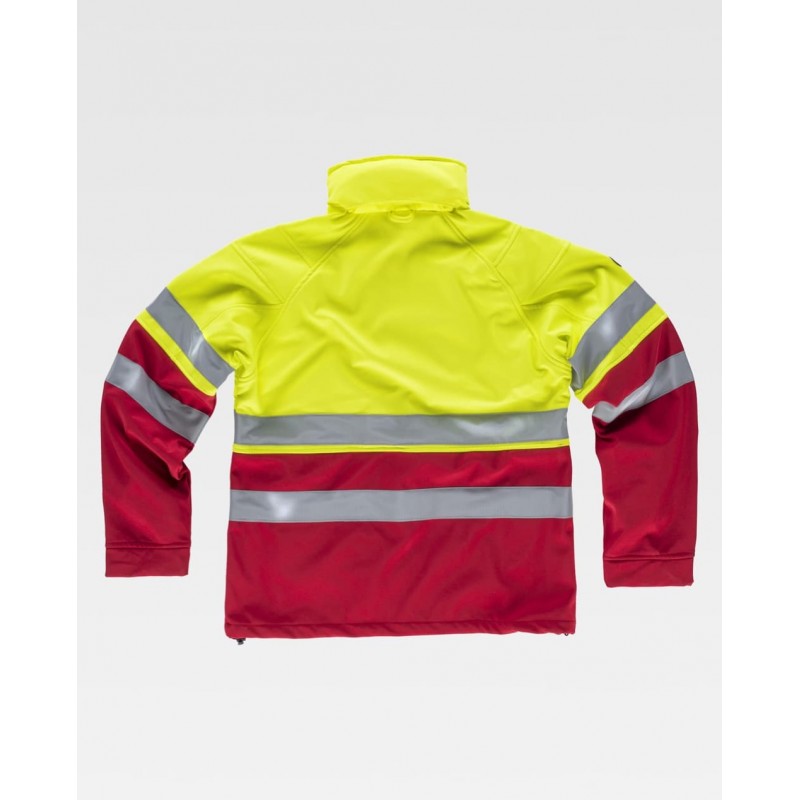 Pantalón Workshell multibolsillos, elástico en cintura, trabillas, dos bolsillos interiores en los costados con cremalleras de nylon, dos bolsillos laterales con cremalleras de nylon, dos bolsos traseros interiores con cremalleras de nylon, dos cintas reflectantes en perneras, combinado con alta visibilidad y cierre de botón y bragueta de cremallera.