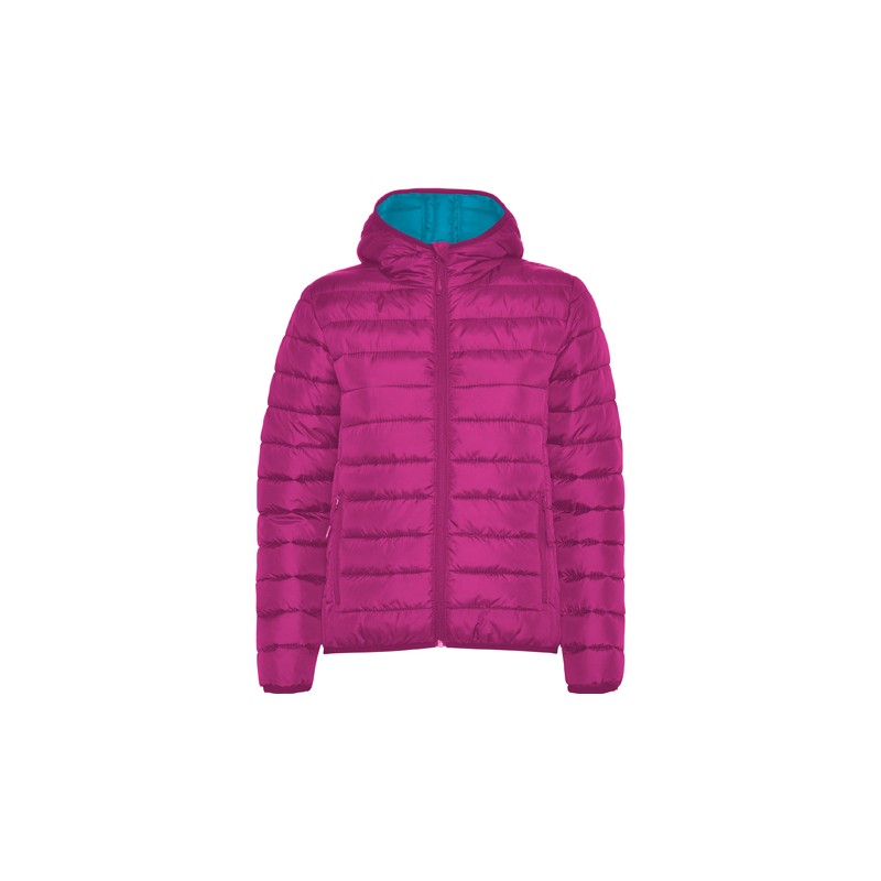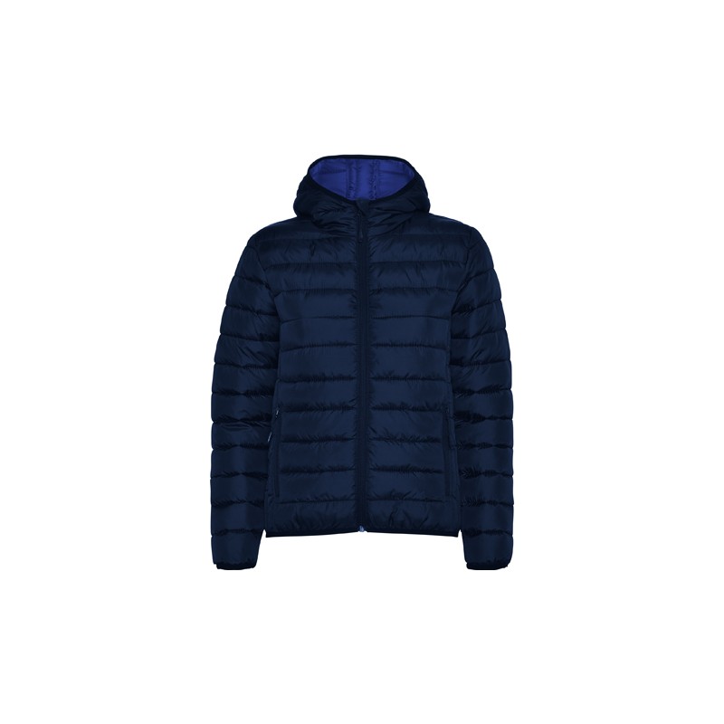 Chaqueta deportiva acolchada con relleno tacto pluma, cremallera frontal invertida a contraste con protector de barbilla y tirador, capucha ajustada fija, bolsillos laterales a contraste con cremallera invertida y tirador, detalles reflectantes en mangas y espalda y patronaje del bajo 4 cm más largo que el modelo NORWAY.