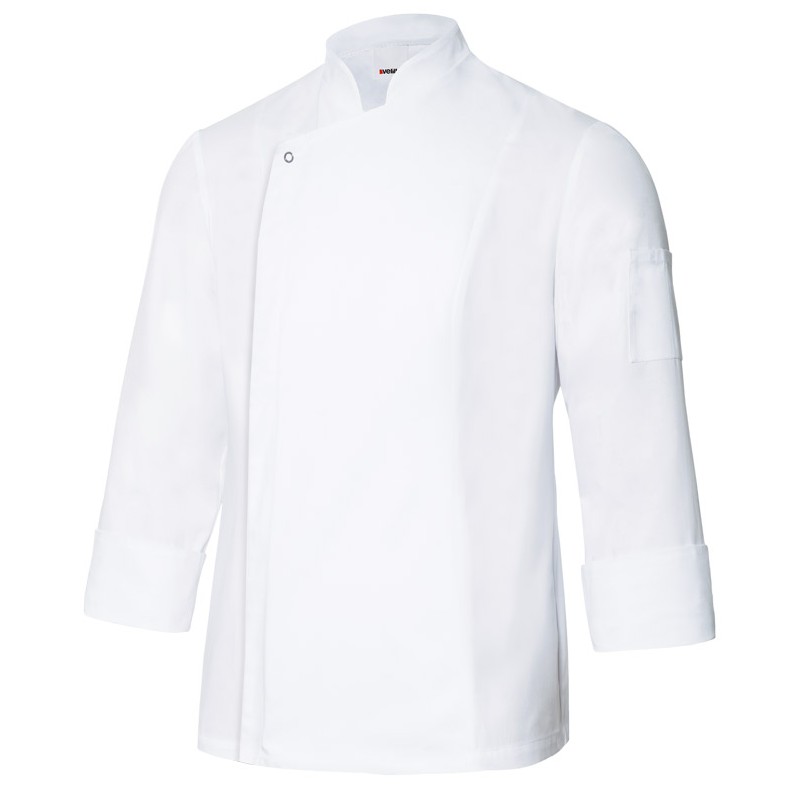 Chaqueta de cocina con tejido transpirable, cierre central asimétrico, con cremallera oculta y un botón automático de arandela, cuello mao, espalda con tejido transpirable Gesdry+, manga tipo sastre, con abertura en puños, sin costura lateral y un bolsillo de parche en manga izquierda.
