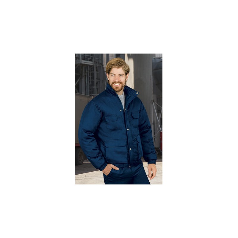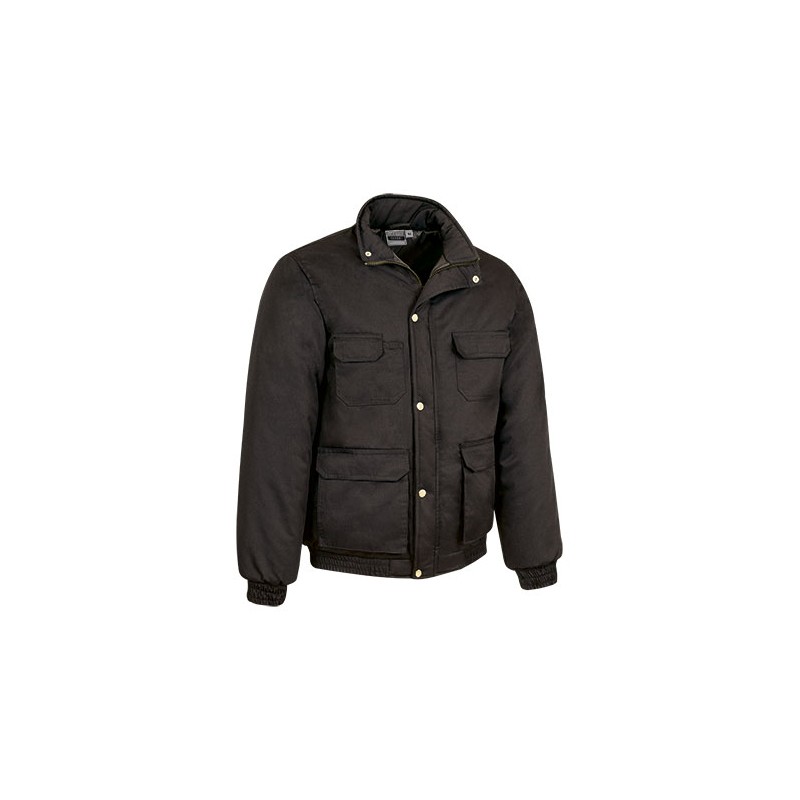Chaqueta de abrigo confeccionada en tejido de sarga, con relleno acolchado y forro liso interior, cuello alto y cremallera central bajo tapeta, con broches a presión, cuatro bolsillos en la parte delantera: dos inferiores con fuelle y dos superiores, uno de ellos con dos departamentos para bolígrafo.