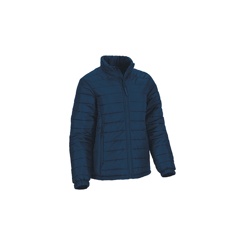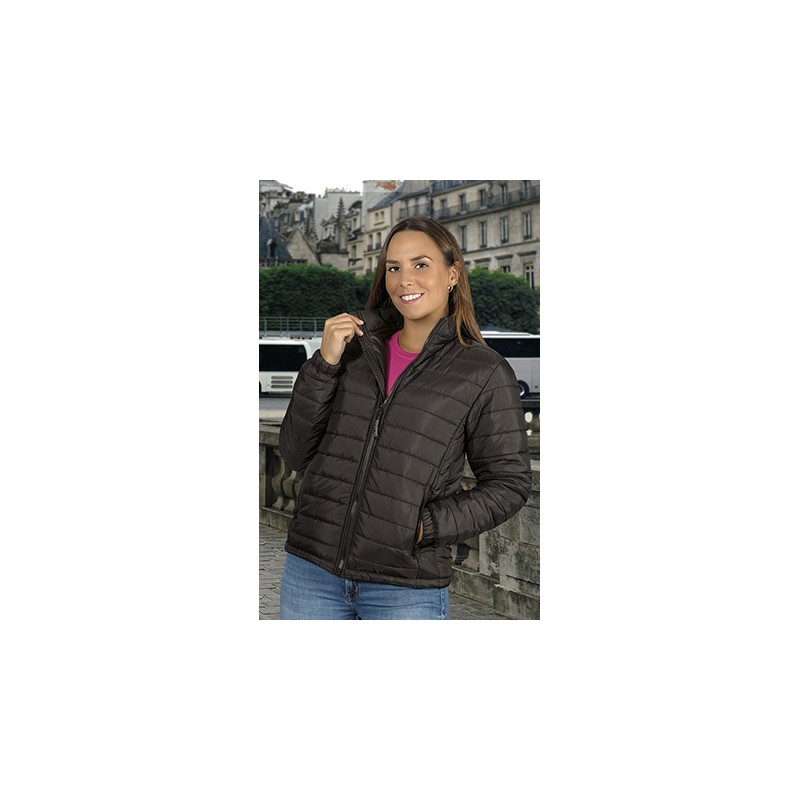 Chaqueta térmica de mujer con corte entallado, confeccionada en tejido Loft ligero y acolchado con exterior plano hidrofugado, relleno acolchado y forro interior que proporciona mayor aislamiento térmico mediante canales.