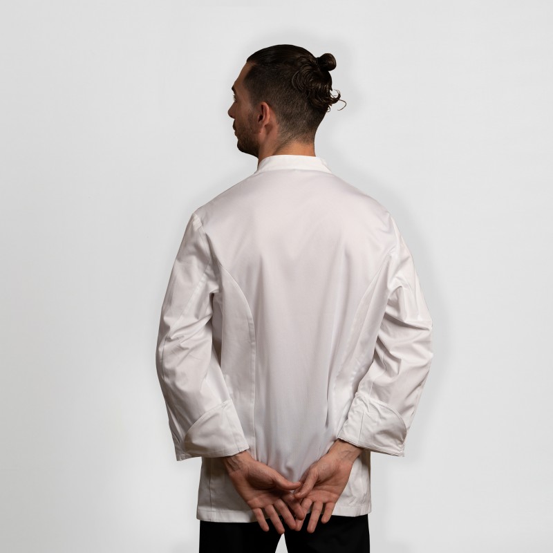 Chaqueta GASTROCHEF para mujer, en manga larga, con puños vueltos, cierre cruzado mediante botones de presión ocultos y bolsillos en pecho y manga izquierda, modelo semi ajustado, con costadillos en espalda y pinzas en el pecho, confeccionada en 100% ALGODÓN EGIPCIO, con la espalda en COOLMAX. Es ideal para cocineros y chefs en hostelería, restauración y...