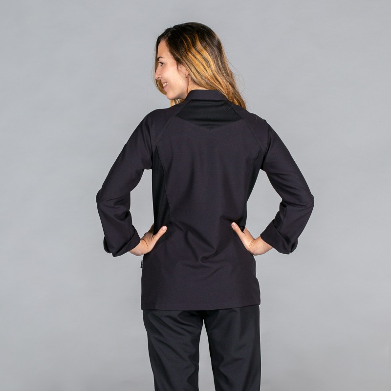 Chaqueta para mujer en manga larga, con puños vueltos, un bolsillo en la manga izquierda y cierre cruzado mediante botones de presión ocultos.
